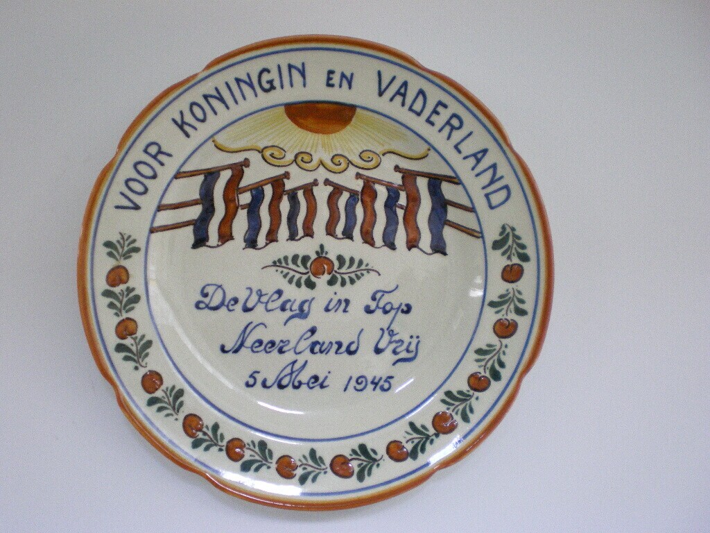 Een wandbord met op een witte achtergrond zes Nederlandse vlaggen, een zon die opkomt en oranjebloesem daaronder: "De vlag in top Neerland vrij 5 mei 1945". Op de rand oranjebloesem en: "Voor Koningin en Vaderland". Op de achterkant gemerkt: "wk Gouda Holland no 6".