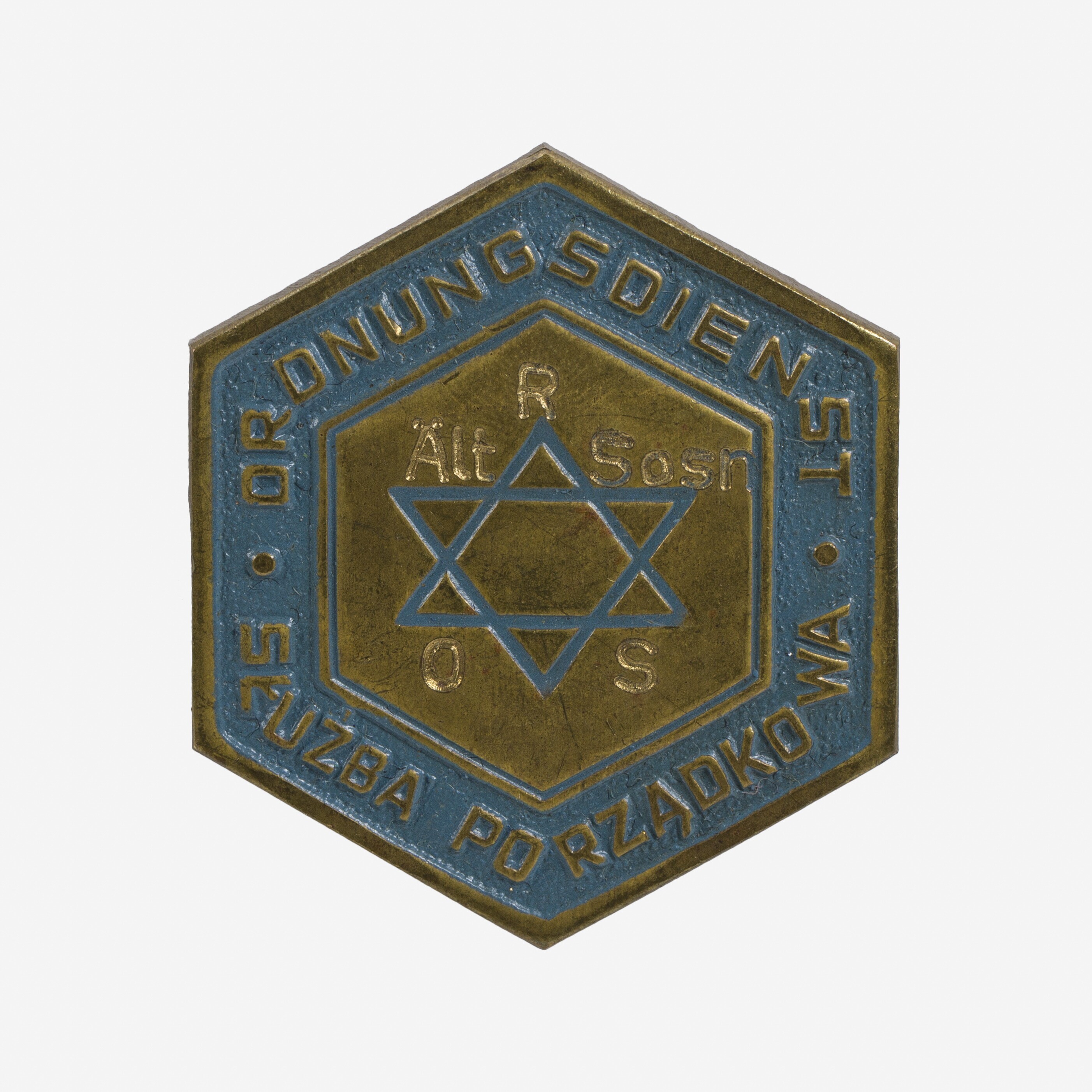 Een zeshoekige koperkleurige penning met aan de achterkant een pin met een schroefdraad, waar een rond koperkleurig plaatje over kan draaien. Op de penning een is een Davidster gegraveerd en met blauwe kleur ingevuld. Rond de ster: "Ält R Sost O S". Langs de rand op een blauwe achtergrond in reliëf: "Ordnungsdienst. Sluzba Porzadkowa".