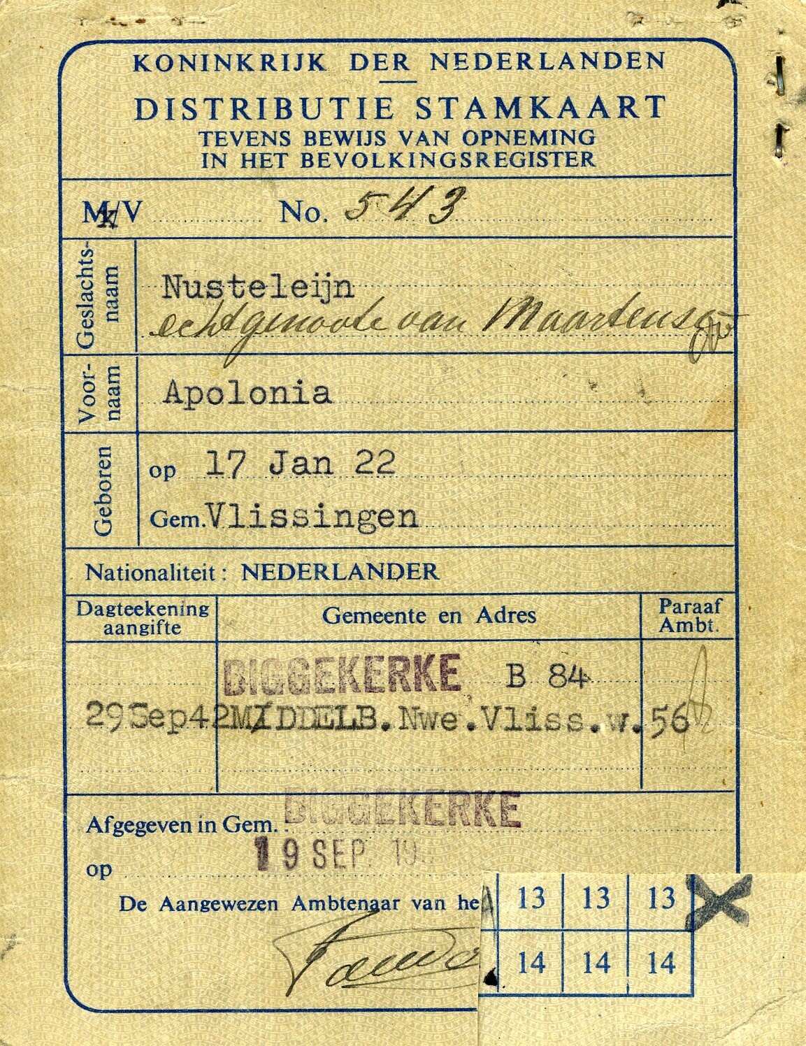 Een Distributie Stamkaart tevens bewijs van opneming in het bevolkingsregister nummer 543 op naam van Apolonia Nusteleijn echtgenote van J. Maartense, geboren op 17 januari 1922 te Vlissingen, wonende (sinds 29 september 1942) aan de Nwe. Vliss. w. 56 te Middelburg. De kaart is afgegeven te Biggekerke op 19 september 19(?). In de kaart zijn twee inlegvellen vastgeniet met bonnen, waarvan er al enkele zijn gebruikt en afgestempeld in 1940, 1943 en in het voorjaar van 1944. Rechtsonder is van het eerste blad een rechthoekig stuk afgeknipt.