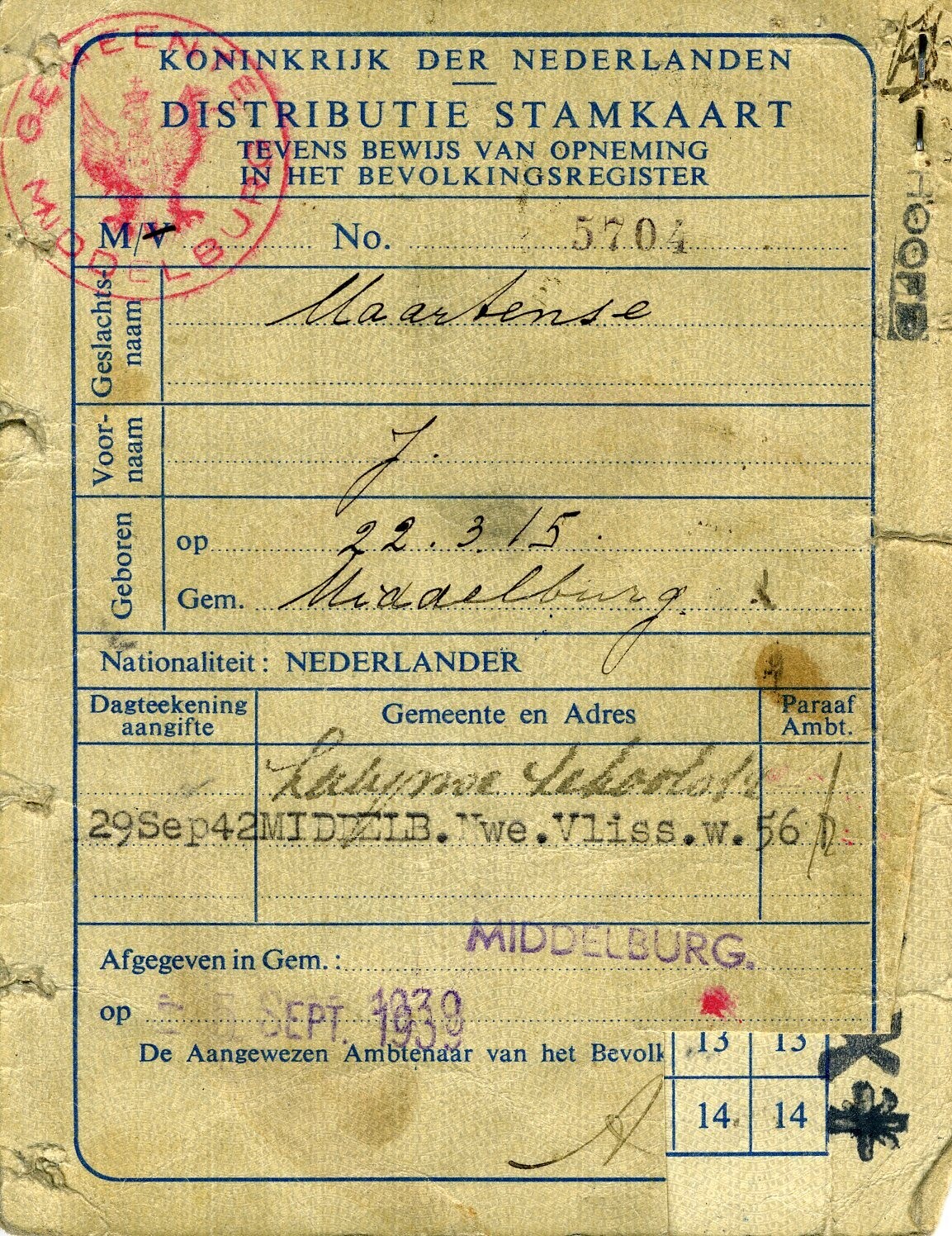 Een Distributie Stamkaart tevens bewijs van opneming in het bevolkingsregister nummer 5704 op naam van J. Maartense, geboren op 22 maart 1915 te Middelburg, wonende (sinds 29 september 1942) aan de Nwe.Vliss.w. 56 te Middelburg. De kaart is afgegeven te Middelburg op (?) september 1939. In de kaart zijn twee inlegvellen vastgeniet met bonnen, waarvan er al enkele zijn gebruikt en afgestempeld in 1943 en in het voorjaar van 1944. Rechtsonder is van het eerste blad een rechthoekig stuk afgeknipt.