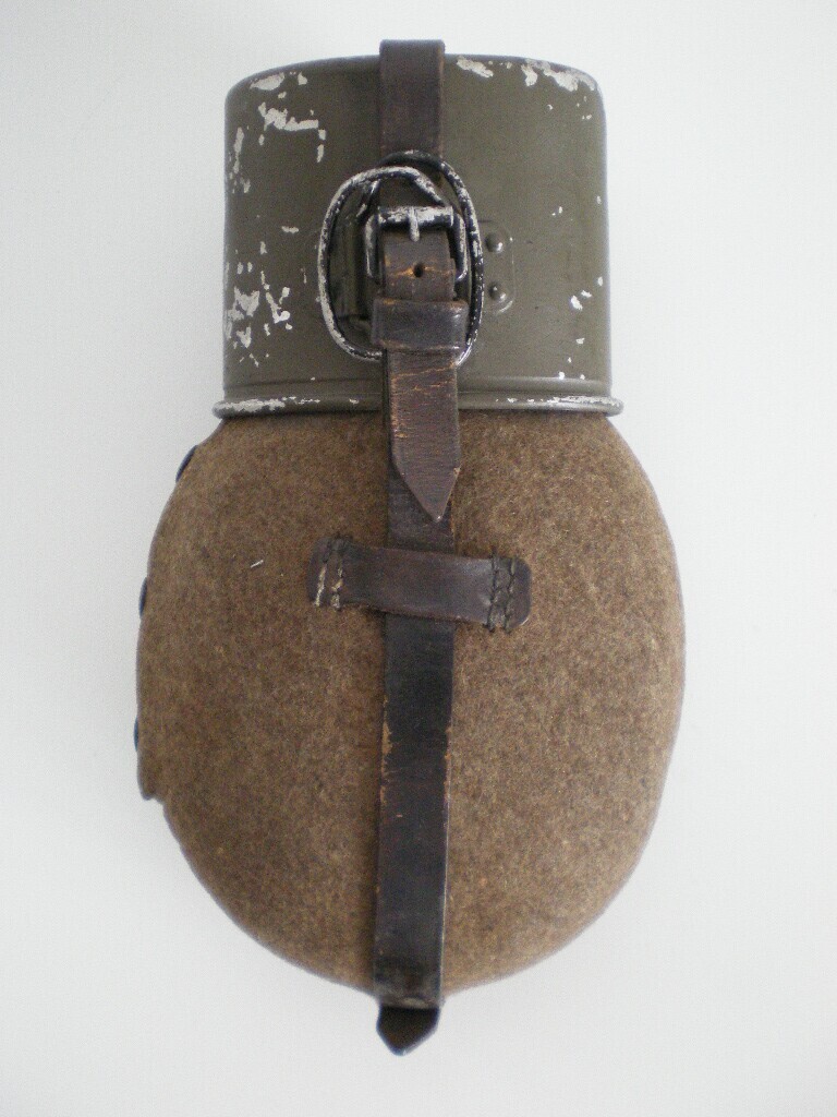 Een Duitse militaire metalen veldfles met bruin vilt overtrokken. Over de dop van de veldfles een bijhorende groene metalen mok met leren riempjes aan de veldfles vastgemaakt. Aan de leren riempjes een haak om de veldfles met mok vast te maken rechtsachter aan de koppel op de broodzak behorend tot de militaire uitrusting.