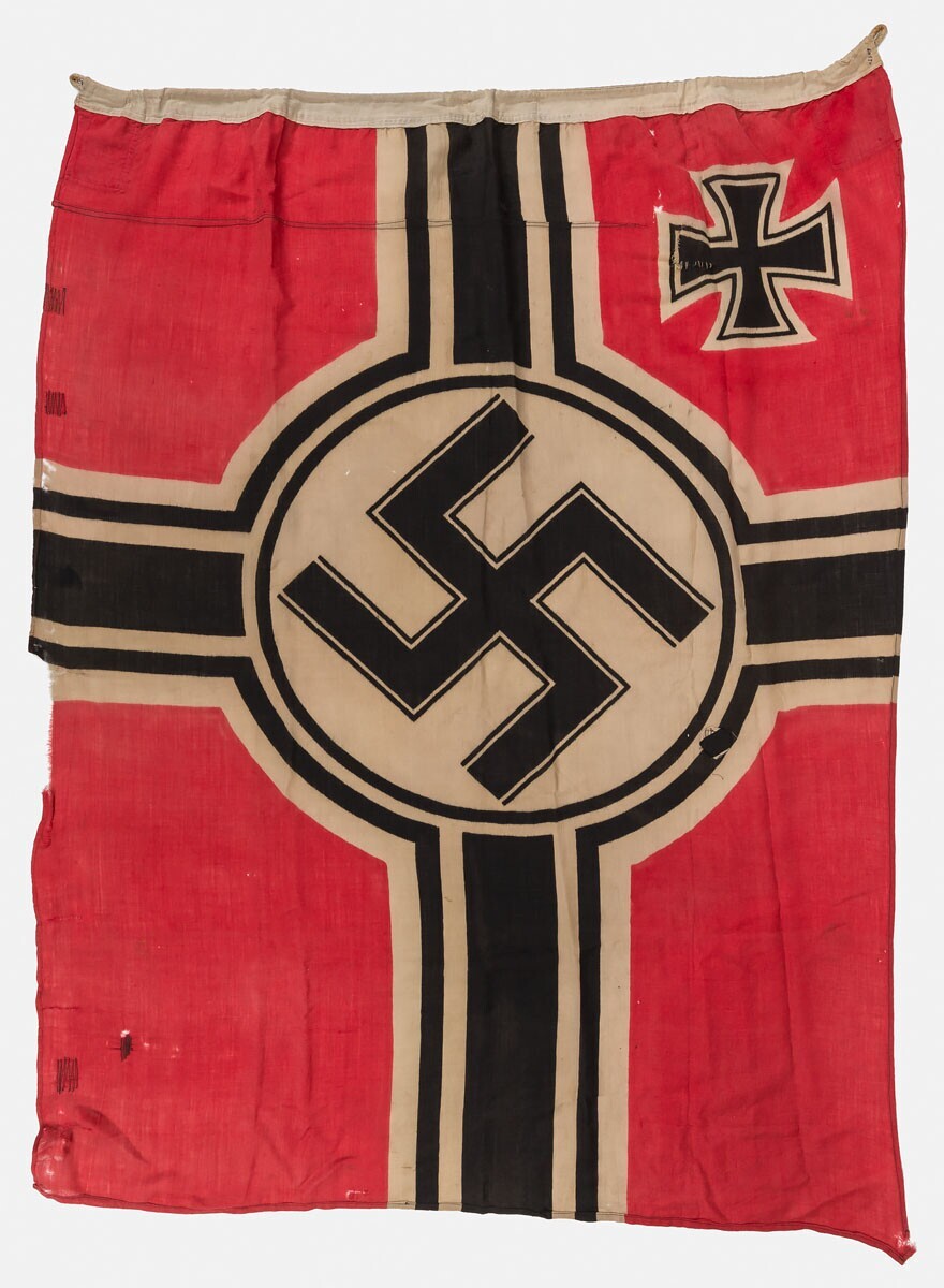 Een "Reichskriegsflagge des Deutschen Reiches" gebruikt van 1938 tot 1945 door de Kriegsmarine. Op de vlag zijn in de kleuren zwart en rood het Duitse IJzeren Kruis en het Nazisymbool: de swastika, aangebracht.
