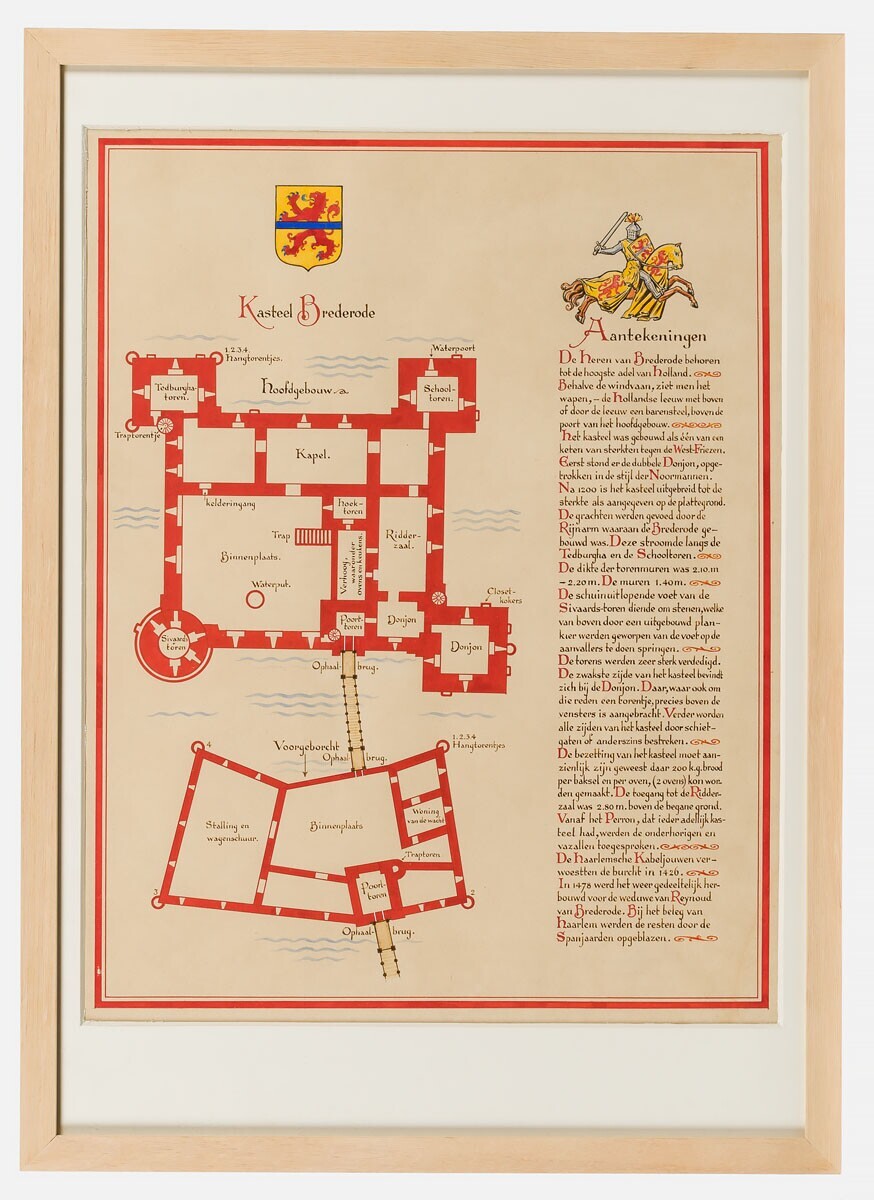Plattegrond van kasteel Brederode, met een beschrijving van hoe het kasteel er uit heeft gezien en de bijbehorende geschiedenis van het kasteel.