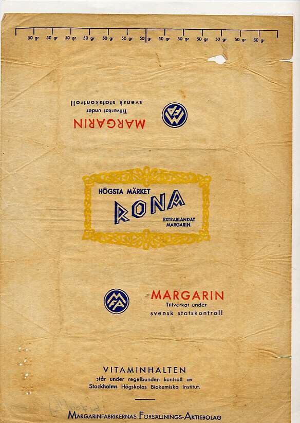 Wikkel van de Zweedse margarine Rona. De merknaam is gedrukt in blauwe letters in een geel omrand kader.