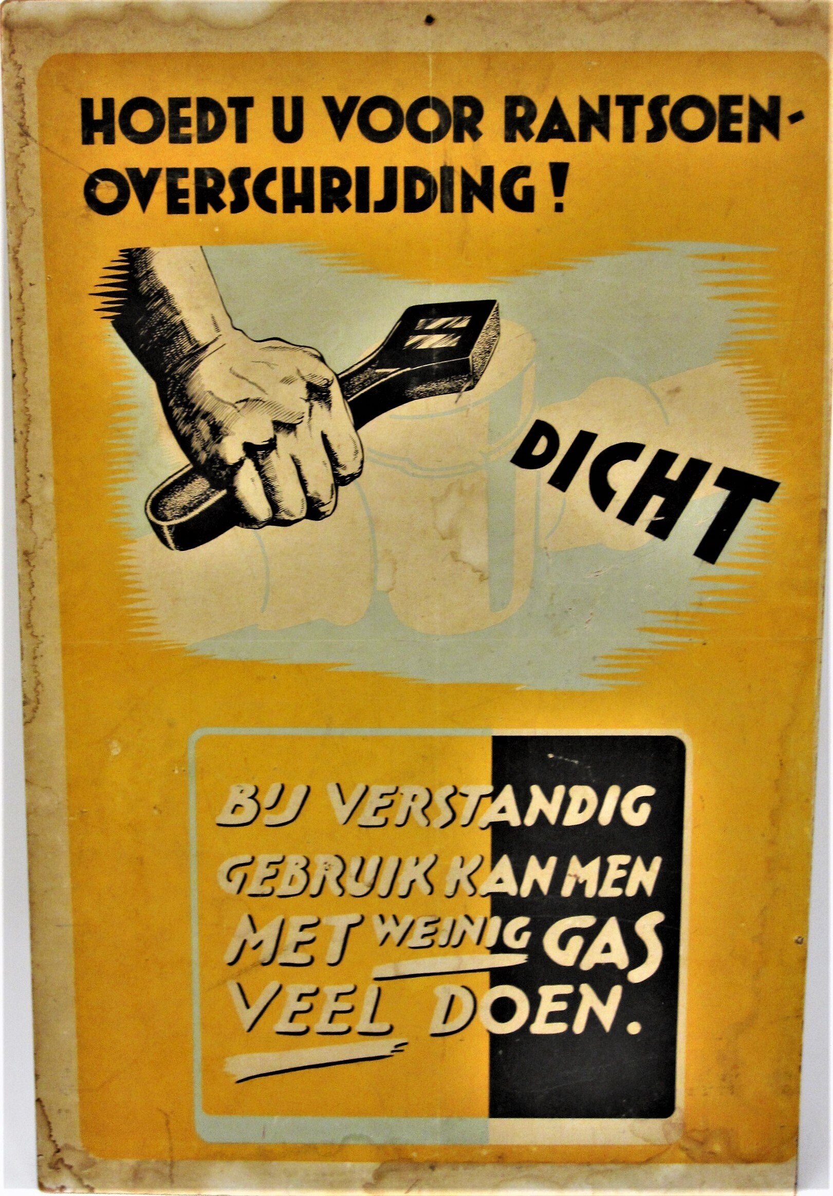 Een affiche met de voorstelling van een gaskraan die wordt dichtgedraaid met daarbij: "Dicht!" op een gele achtergrond. Overige tekst op het affiche: "Hoedt u voor rantsoenoverschrijding! Bij verstandig gebruik kan men met weinig gas veel doen."