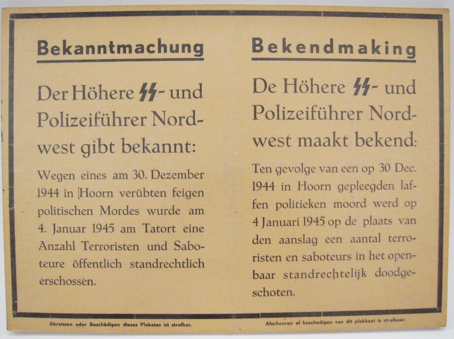 Een in het Duits en Nederlands opgestelde bekendmaking: "De Höhere SS- und Polizeiführer Nordwest maakt bekend: Ten gevolge van een op 30 Dec. 1944 in Hoorn gepleegden laffen politieken moord werd op 4 januari 1945 op de plaats van den aanslag een aantal terroristen en saboteurs in het openbaar standrechtelijk doodgeschoten."