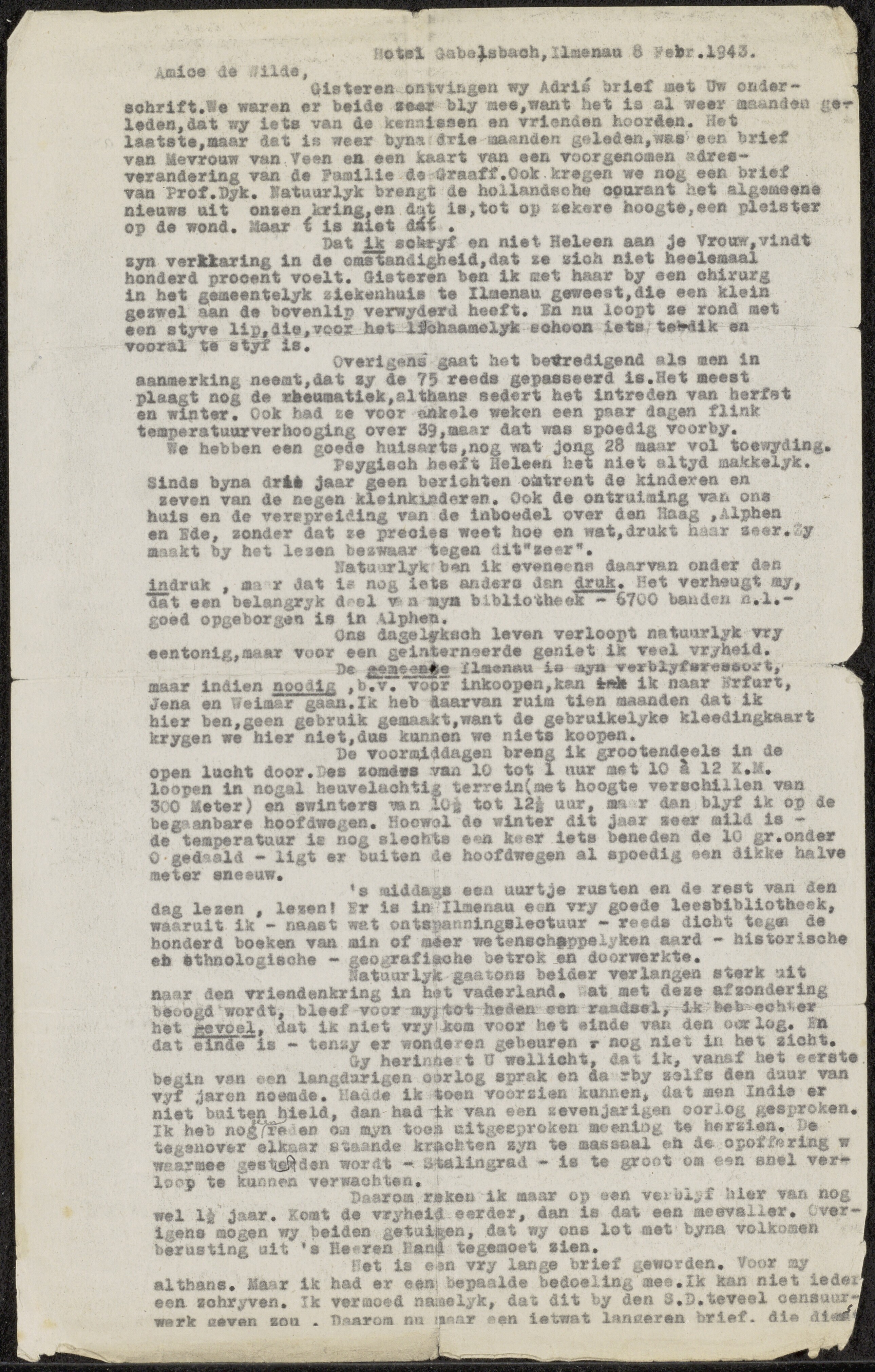 Gestencilde brief van Hendrik Colijn aan "Amice de Wilde", geschreven op 8 februari 1943 in hotel Gabelsbach, Ilmenau. Onderwerpen: de gezondheid van zijn vrouw Heleen, zijn leven als geïnterneerde met relatief veel vrijheid en de te verwachten lange duur van de oorlog.