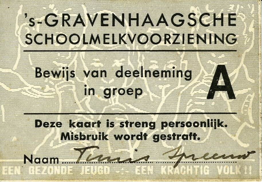 Een bewijs van deelneming in groep A van de 's-Gravenhaagsche Schoolmelkvoorziening op naam van Teunis Spreeuw. De tekst op het kaartje is gedrukt op een achtergrond van melkdrinkende kinderen.