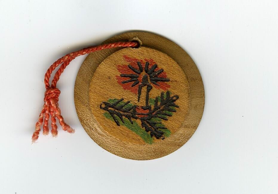 Een ronde houten hanger met een rood koordje uit de serie 'Kerstmis'. De hangers werden uitgereikt tijdens de collectie op 22 en 23 december 1941 van de Winterhulp Nederland. Op deze hanger de voorstelling van een brandende kaars op een dennentak.