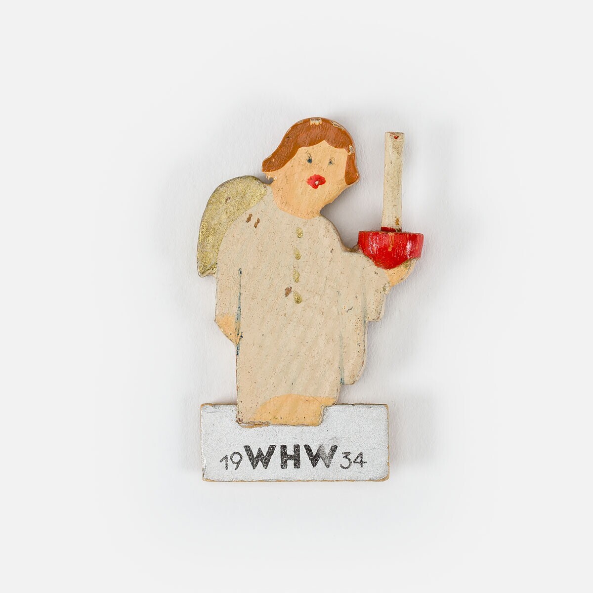 Een houtsnijwerkje met de voorstelling van een engel met een kaars in de linker hand. Het engeltje is voornamelijk in de kleuren wit, goud, bruin en rood geverfd. Onderaan is het engeltje gevat in een rechthoekig zilver geverfd kartonnen houdertje. Op het zilver in zwarte letters: "19 WHW 34".