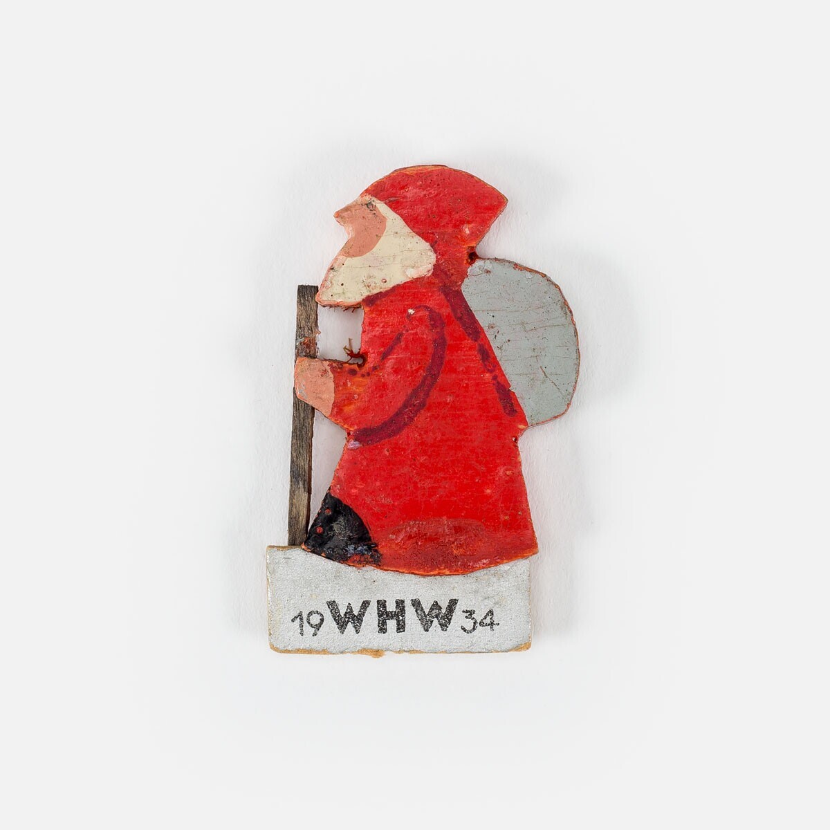 Een houtsnijwerkje met de voorstelling van een kerstman met een zak op de rug en een staf in de hand. De kerstman is voornamelijk in de kleuren wit, grijs en rood geverfd. Onderaan is de kerstman gevat in een rechthoekig zilver geverfd kartonnen houdertje. Op het zilver in zwarte letters: "19 WHW 34".