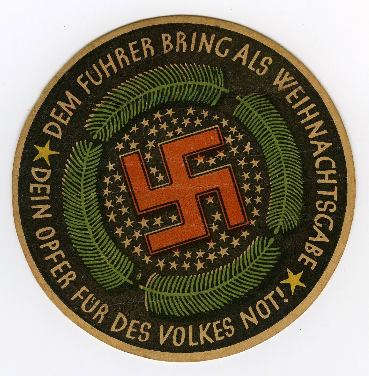 Een bierviltje met zwarte opdruk. In het midden een rood ingekleurd hakenkruis tegen een achtergrond van witte sterren. Hierom vier dennentakken. Langs de rand de tekst: "Dem Fuhrer bring als Weihnachsgabe dein Opfer für des Volkes Not!".