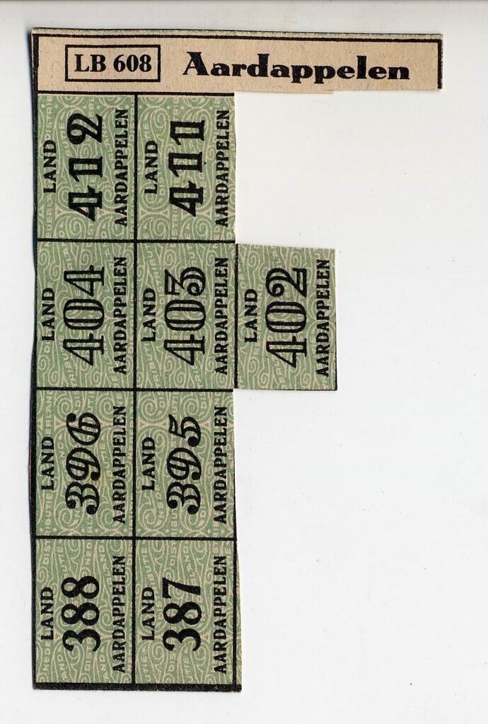 Gedeelte van een gebruikte bonkaart LB 608 - Aardappelen - met zwarte, en groene opdruk.