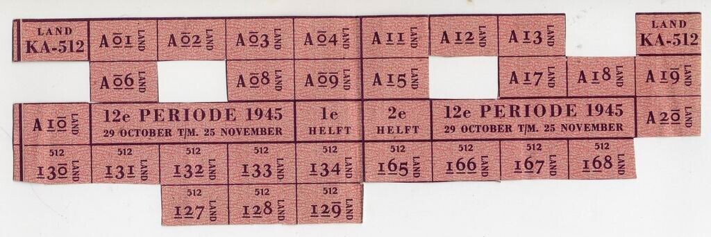 Gedeelte van een gebruikte bonkaart KA-512 Land - 12e periode 1945 - 29 oct. t/m 25 nov. - met paarse en roze opdruk.