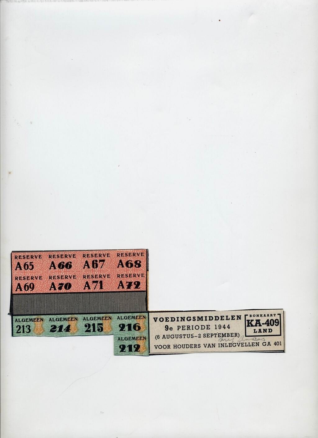 Gedeelte van een gebruikte bonkaart KA-409 Land - Voedingsmiddelen 9e periode 1944 - (6 augustus - 2 september) voor houders van inlegvellen GA 401 - met zwarte, roze, groene en gele opdruk. Met potlood de naam mej. Lucas en de naam Mevr. Theemste(?).