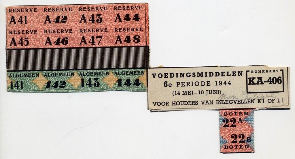 Gedeelte van een gebruikte bonkaart KA-406 Land - Voedingsmiddelen 6e periode 1944 - (14 mei - 10 juni) voor houders van inlegvellen K 1 of L 1 - met zwarte, groene, blauwe, roze en gele opdruk. Met potlood de naam mevr. Philipse en Ph.J. Langeveld.