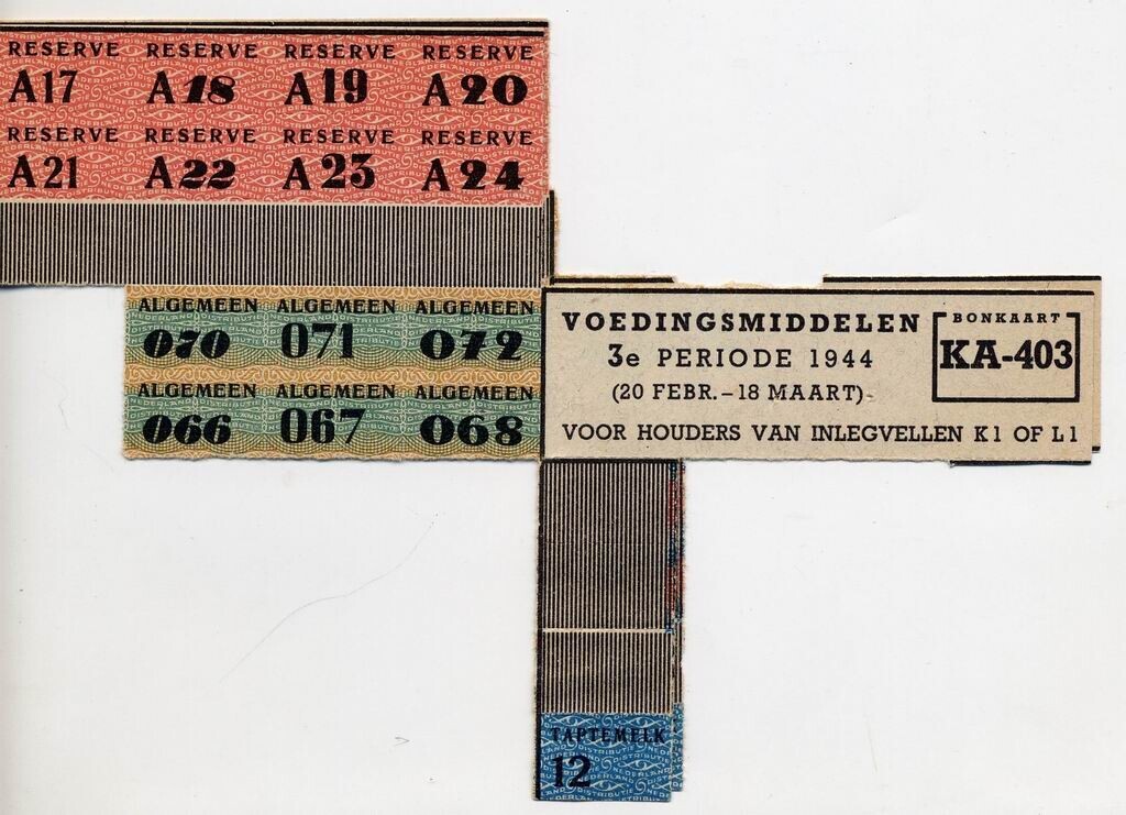 Gedeelte van een gebruikte bonkaart KA-403 Land - Voedingsmiddelen 3e periode 1944 - (20 febr. - 18 maart) voor houders van inlegvellen K 1 of L 1 - met zwarte, groene, blauwe, roze en gele opdruk.