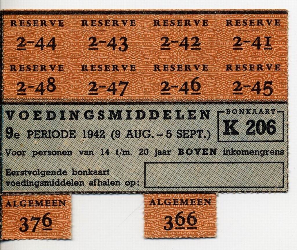 Gedeelte van een gebruikte bonkaart K 206 - Voedingsmiddelen 9e periode 1942 - (9 aug. - 5 sept.) voor personen van 4 t/m 20 jaar boven inkomengrens. - met zwarte, oranje en groene opdruk.