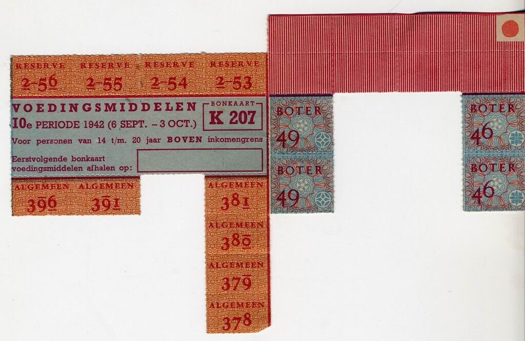 Gedeelte van een gebruikte bonkaart K 207 - Voedingsmiddelen 10e periode 1942 - (6 sept. - 3 oct.) voor personen van 4 t/m 20 jaar boven inkomengrens. - met rode, blauwe en oranje opdruk.
