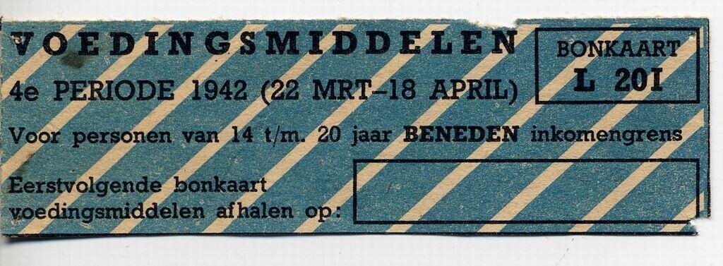 Gedeelte van een gebruikte bonkaart L 201 - Voedingsmiddelen 4e periode 1942 - (22 mrt - 18 april) voor personen van 4 t/m 20 jaar beneden inkomengrens. - met zwarte en blauwe opdruk.