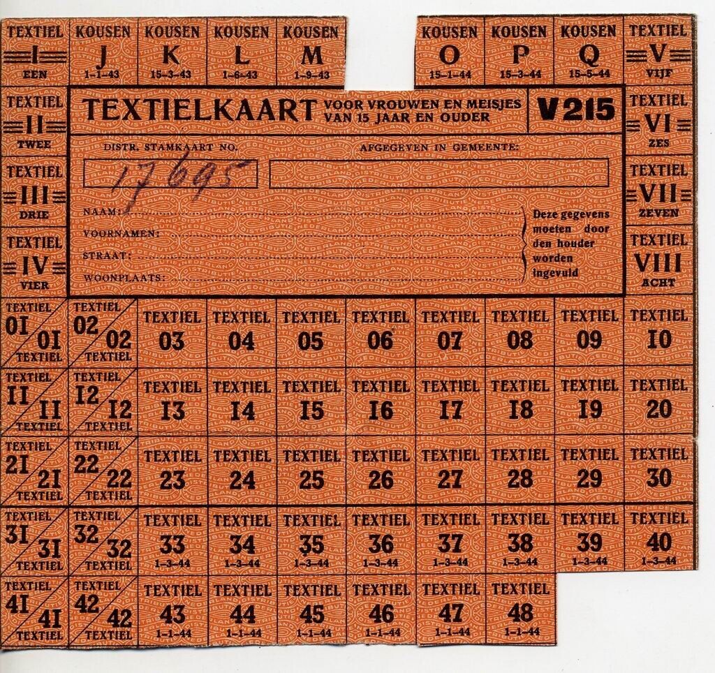 Gedeelte van een gebruikte bonkaart V 215 - Textielkaart voor vrouwen en meisjes van 15 jaar en ouder - bonnen voor 1943 en 1944 - met zwarte en oranje opdruk.