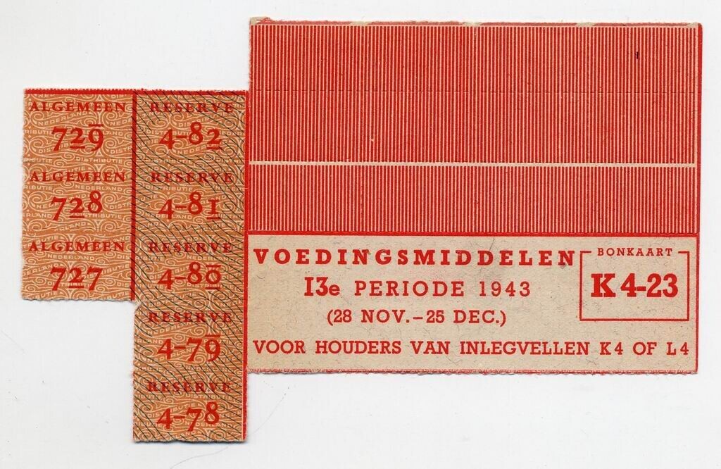Gedeelte van een gebruikte bonkaart K 4-22 - Voedingsmiddelen 13e periode 1943 (28 nov. - 25 dec.) - Voor houders van inlegvellen K4 of L4. - met rode, blauwe en oranje opdruk.