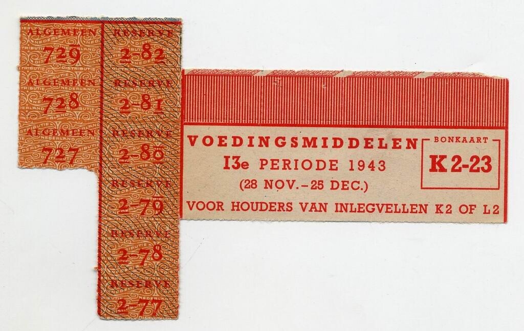 Gedeelte van een gebruikte bonkaart K 2-23 - Voedingsmiddelen 13e periode 1943 (28 nov. - 25 dec.) - Voor houders van inlegvellen K2 of L2. - met roze, blauwe en oranje opdruk.