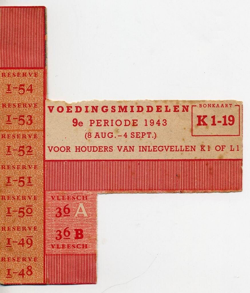 Gedeelte van een gebruikte bonkaart K 1-19 - Voedingsmiddelen 9e periode 1943 (8 aug. - 4 sept.) - Voor houders van inlegvellen K1 of L1. - met rode en oranje opdruk.