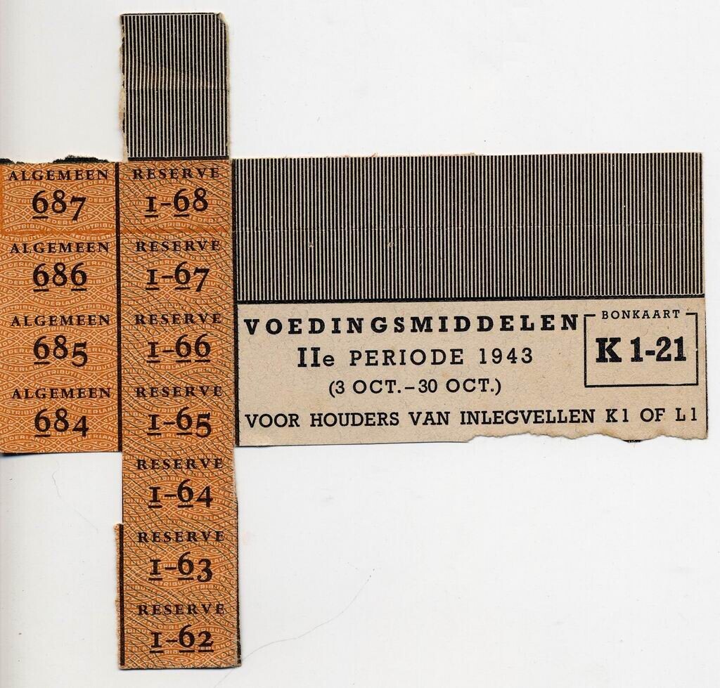 Gedeelte van een gebruikte bonkaart K 1-21 - Voedingsmiddelen 11e periode 1943 (3 oct. - 30 oct.) - Voor houders van inlegvellen K1 of L1. - met zwarte en oranje opdruk.