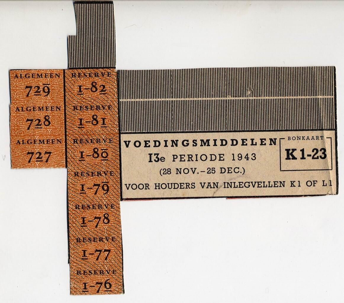 Gedeelte van een gebruikte bonkaart K 1-23 - Voedingsmiddelen 13e periode 1943 (28 nov. - 25 dec.) - Voor houders van inlegvellen K1 of L1. - met zwarte en oranje opdruk.