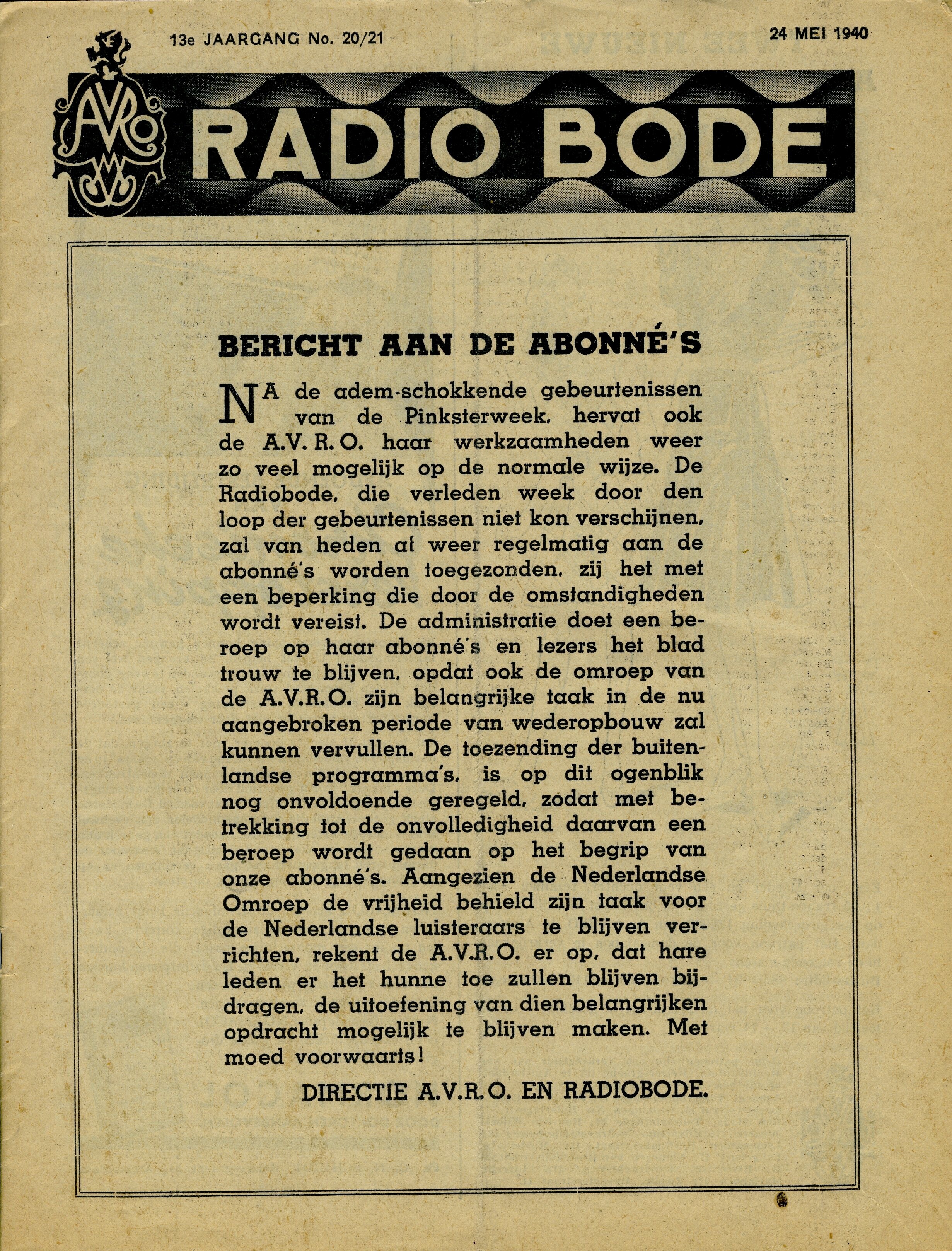 Een radiobode van de A.V.R.O., 13e jaargang no. 20/21, 24 mei 1940 met een "Bericht aan de abonné's" waarin wordt aangegeven dat "na de adem-schokkende gebeurtenissen van de Pinksterweek (de Duitse inval)", de werkzaamheden van de A.V.R.O. weer zoveel mogelijk op de normale wijze worden hervat.