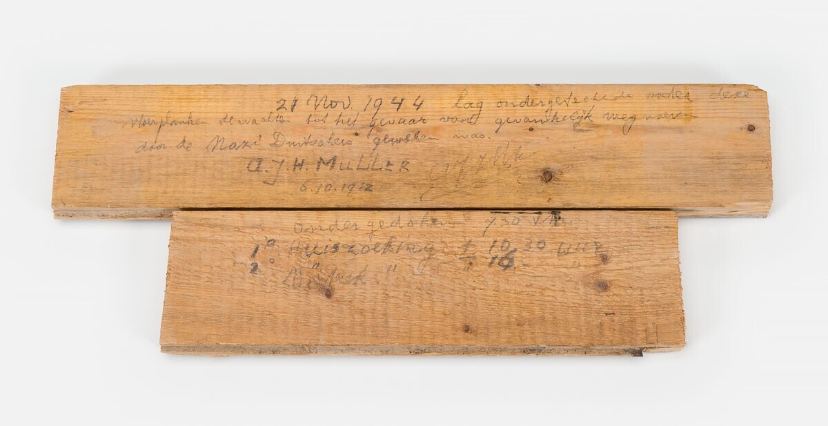 Twee vloerplanken uit het huis aan de Van de Wateringelaan 117 te Voorburg: aan de onderkant staat op de langste plank in potlood geschreven: "21 Nov. 1944 lag ondergetekende onder deze vloerplanken te wachten tot het gevaar van gevankelijk wegvoeren door de Nazi Duitsers geweken was. A.J.H. Muller 6.10.1912" gevolgd door zijn handtekening. Op de aansluitende kleinere vloerplank staat in potlood: "Ondergedoken 7.30 v.m. 1e huizoeking ca 10.30 uur 2e huiszoeking ca 16.00 uur Vertrek".