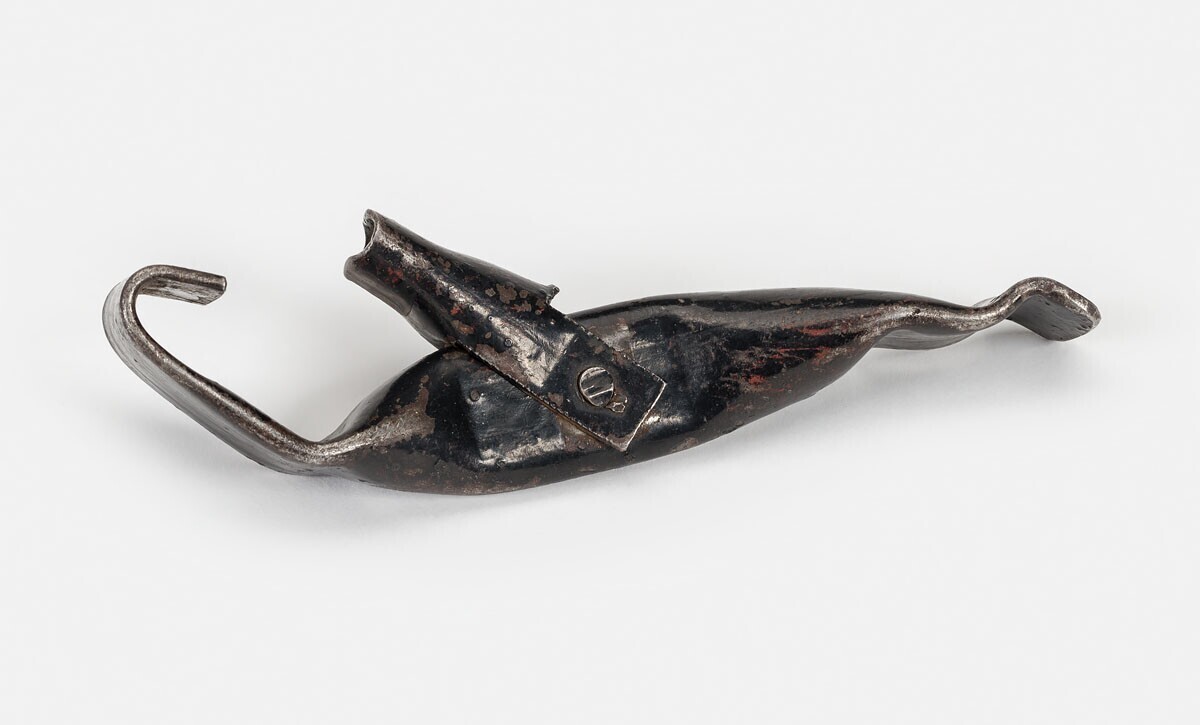 Een bandenlichter gemaakt uit een stuk zwart geverfd metaal met aan één kant een haak en de andere kant een iets omhoog gebogen stuk. In het midden een stukje metaal aan een scharnier.