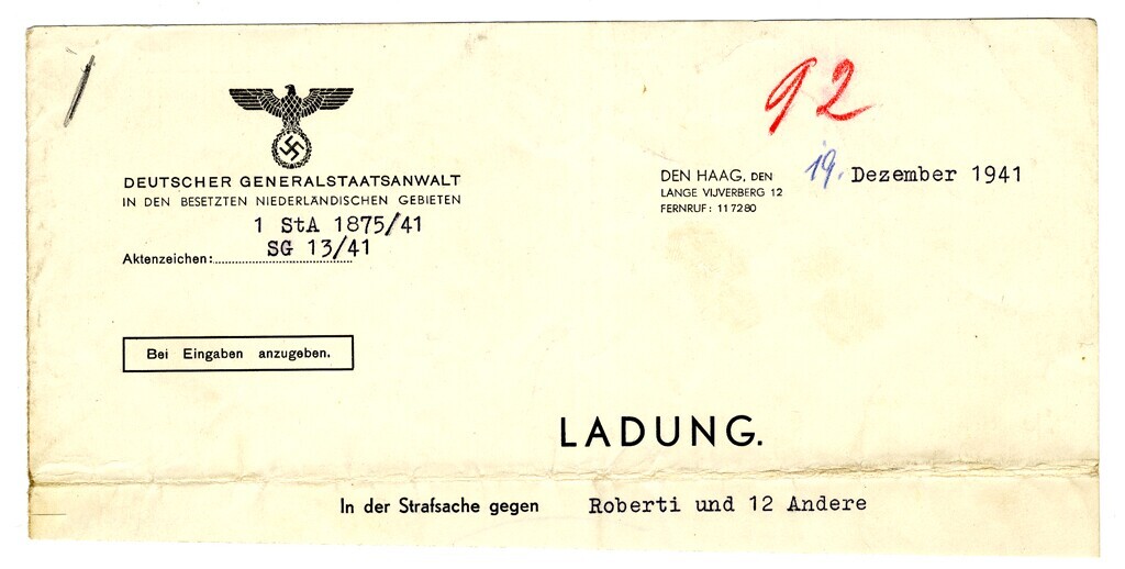Dagvaarding van de Deutscher Generalstaatsanwalt te Den Haag, 19 Dezember 1941. Dossiernummer: 1 STA 1875/41 SG 13/41 in de strafzaak tegen Roberti en 12 anderen.