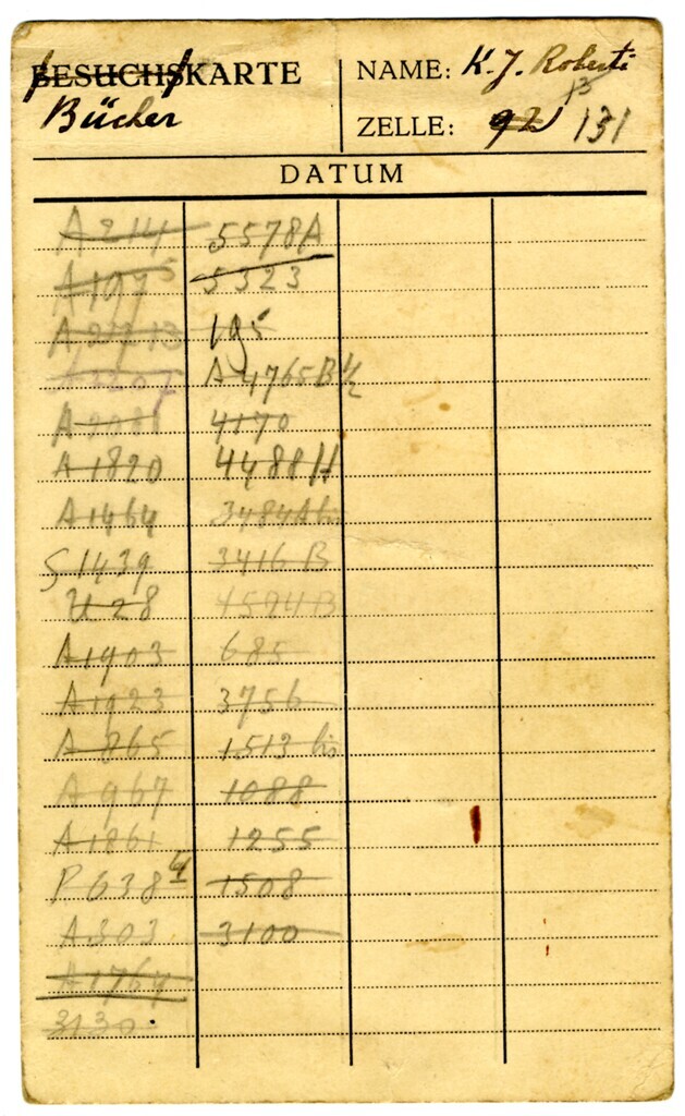 Een "Besuchskarte" hergebruikt als "Bücherkarte" op naam van K.J. Roberti, Zelle 131. Op de kaart staan met potlood doorgestreepte nummers.