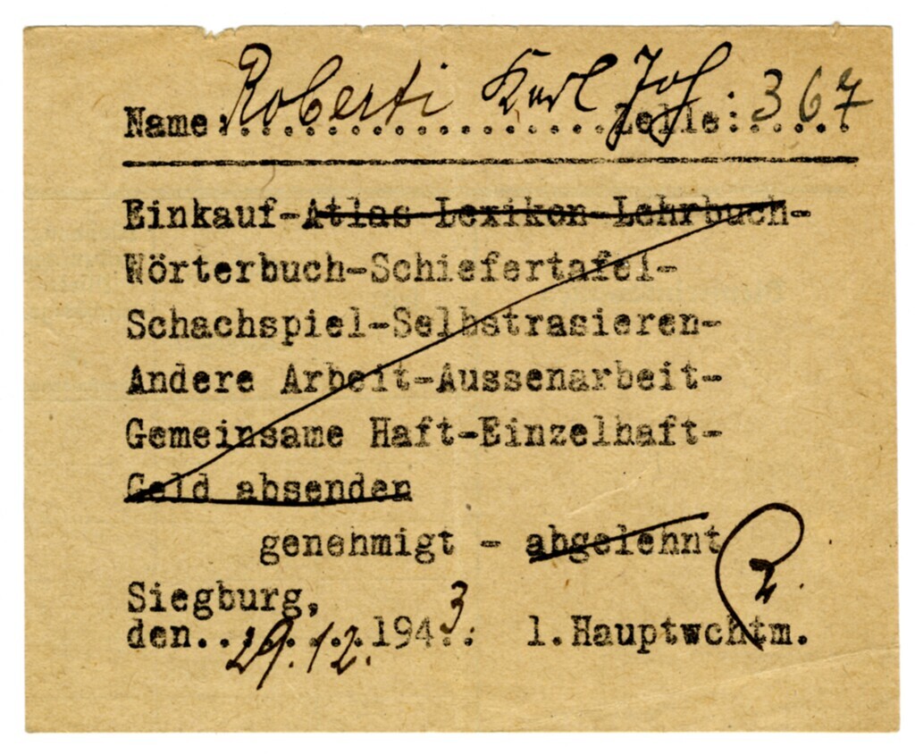 Op een deel van een Duits formulier is een kwitantie gedrukt op naam van "Roberti Karl Joh. Zelle: 367". De aankoop is toegestaan en gedateerd op 29-12-1943 door de L. Hauptwachtmann.<br>