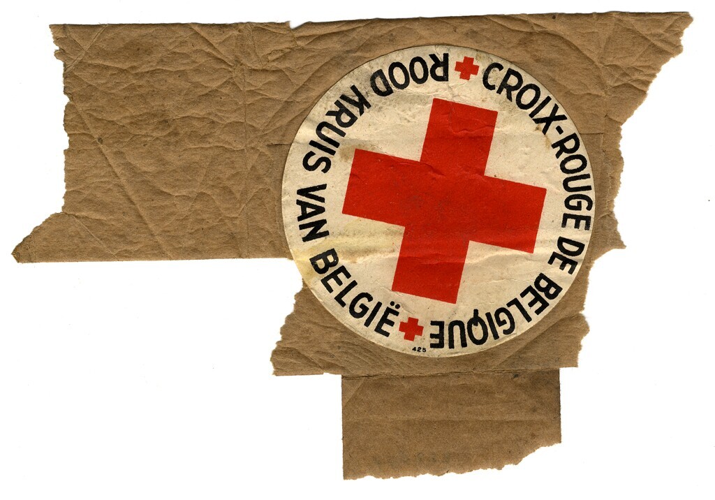 Een ronde sticker met het symbool van het Rode Kruis met daaromheen: "Rood Kruis van België - Croix Rouge de Belgique" geplakt op stuk bruin pakpapier.