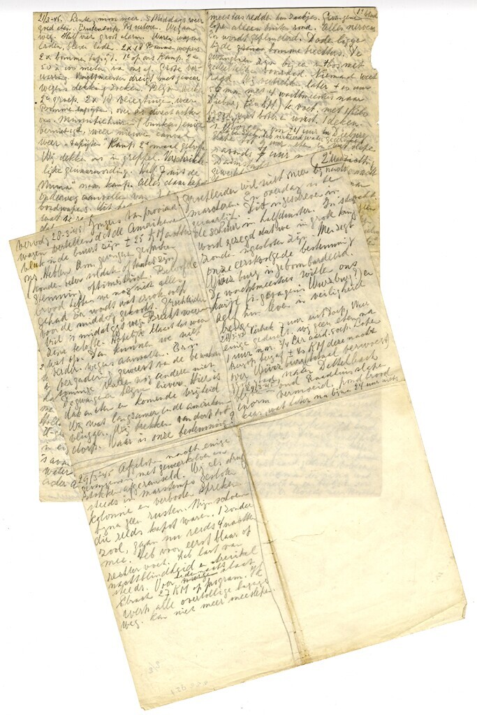Twee dunne vellen papier met een dagboekverslag over de geallieerde opmars in Duitsland geschreven met potlood. De aantekeningen zijn in klommen van vier opgemaakt. Eén blad is dubbelzijdig beschreven.