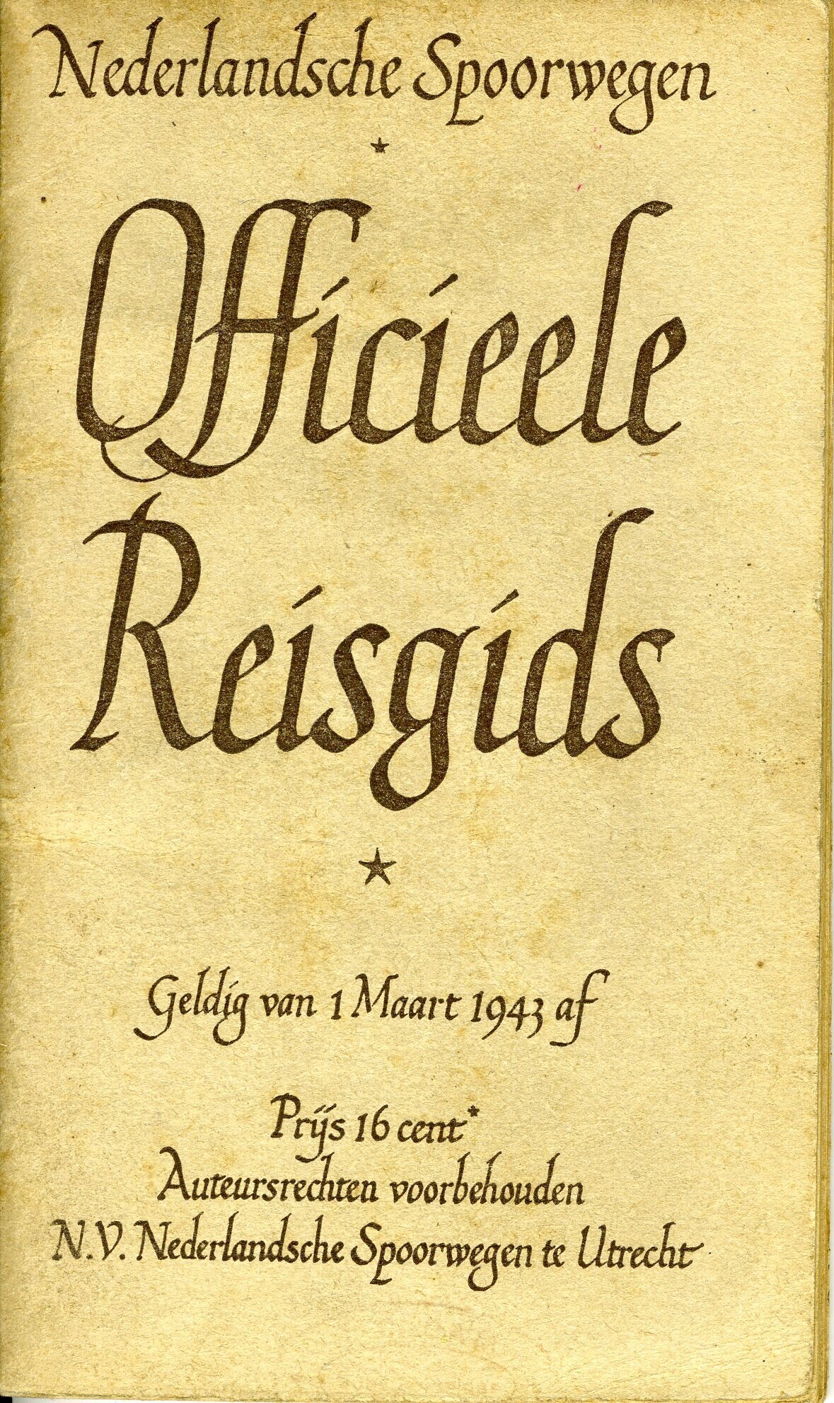 Drie dienstregelingen van de Nederlandsche Spoorwegen, geldig respectievelijk vanaf 1 maart, 5 juli en 1 november 1943. Nederlands- en Duitstalig.