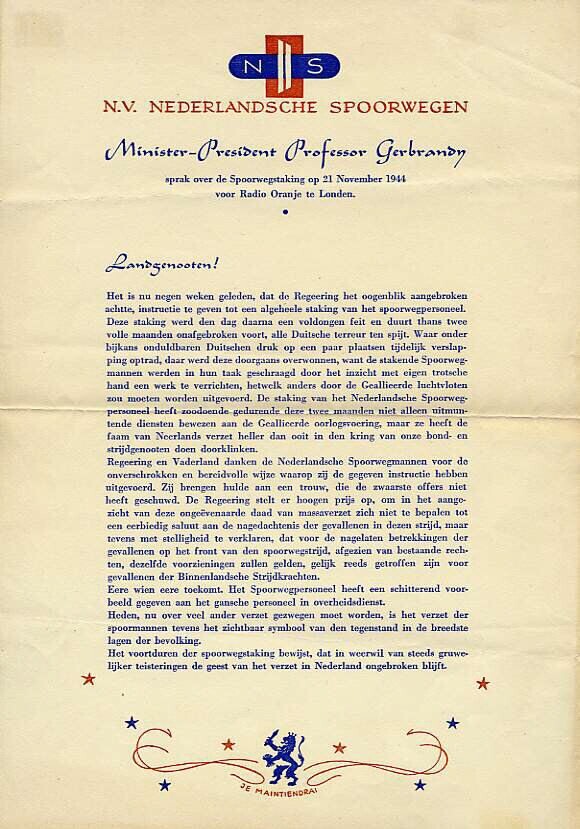 In rood wit blauw uitgevoerd blad met de tekst van een toespraak van minister-president Gerbrandy voor Radio Oranje over de Spoorwegstaking, gehouden op 21 november 1944, gedrukt op papier van de N.S.