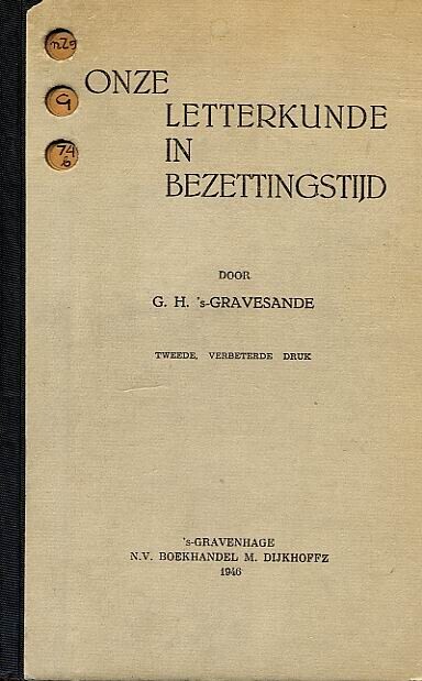 Boek over letterkunde in bezettingstijd. Achter in het boek een lijst van auteurs die tijdens de oorlog illegaal hebben gepubliceerd met bijbehorende schuilnaam. Linksboven in de kaft zijn drie gaatjes geponst. Het is de tweede druk uit 1946 en telt 40 pagina's.