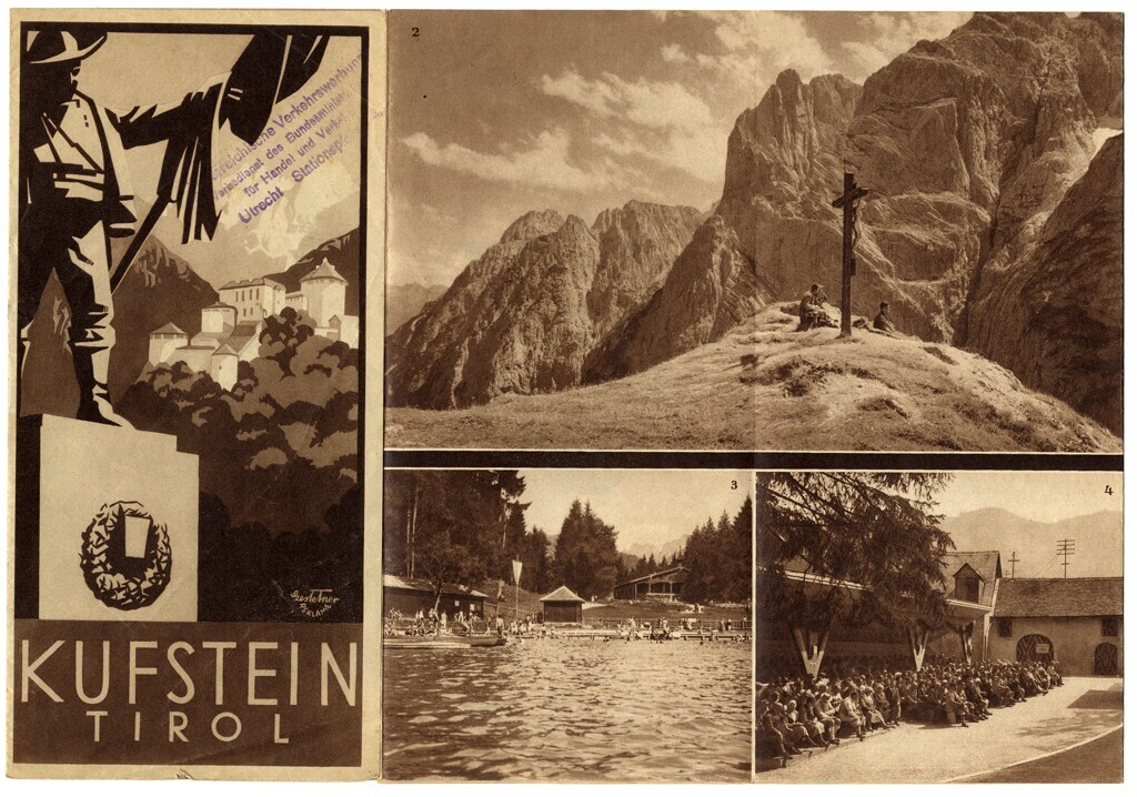 Een toeristische folder in de kleuren bruin en wit van Kufstein in Tirol. Op de voorkant een blauwe stempel met de tekst: "Österreichische Verkehrswerbung. Werbedienst des Bundesministerium für Handel und Verkehr. Utrecht Stationsplein".<br>