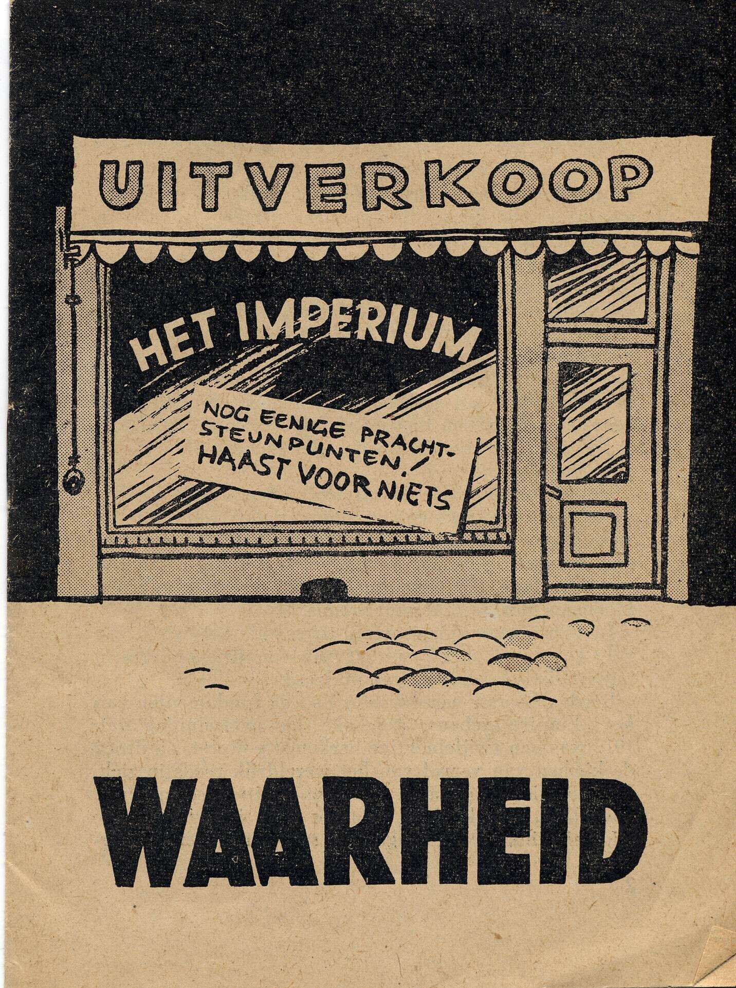 Geïllustreerde anti-Engelse en anti-Amerikaanse boekje met als conclusie: "Engelands generalen strijden onder Amerikaansch opperbevel ". Op de omslag een winkelruit met erop de naam "Het Imperium" en een blad met de tekst: "Nog eenige prachtsteunpunten! Haast voor niets." Erboven de vermelding: "Uitverkoop". Het boekje omvat 12 pagina's.
