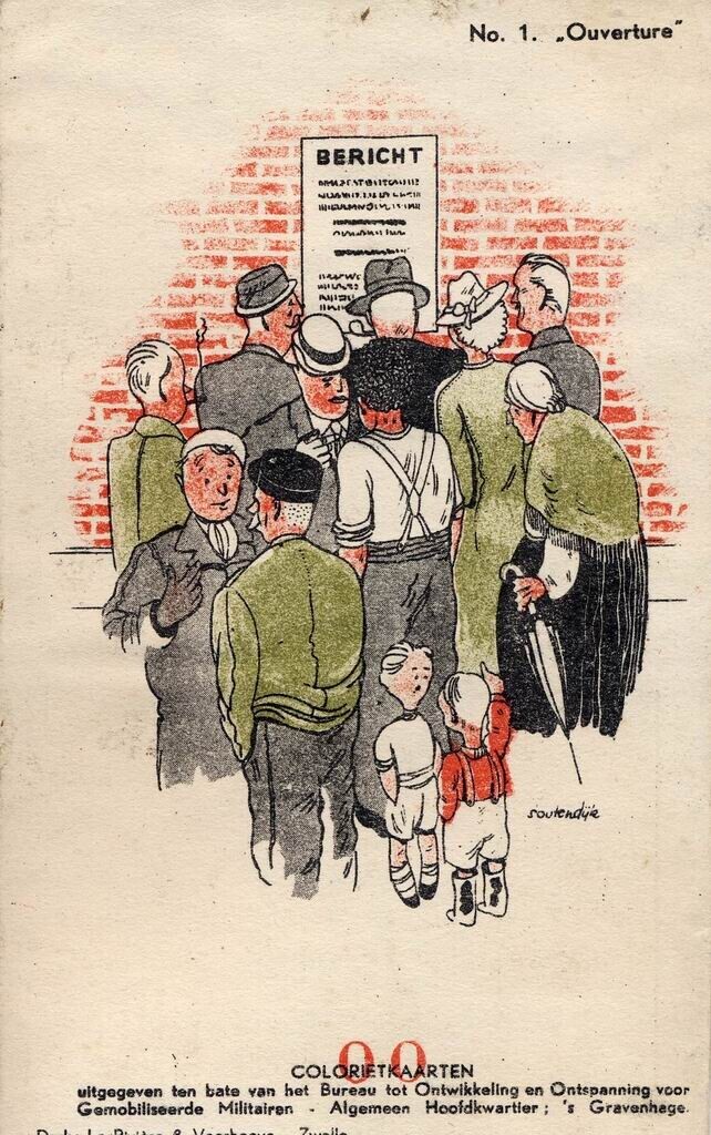 Een 'ringbandalbum' van het merk "Duopress" met een zwarte kartonnen kaft. Op de rug de titel: "Nederland 21 Sept. 1939 - 9 Mei 1940". In het album zijn op doorzichtige vellen papier krantenknipsels geplakt die gaan over alles wat met de oorlogsdreiging in deze periode te maken heeft. Tussen de geplakte en enkele losse krantenknipsels zijn ook andere documenten te vinden in het album: - zwart-wit foto's: * een foto van mannen in uniform die in hun handen waarschijnlijk aanplakbiljetten dragen met betrekking tot de mobilisatie; * een foto van een grote groep gemobiliseerde militairen op een perron; * 3 foto's van gevechtsvliegtuigen. Op één daarvan de tekst: "Glenn Martin bommenwerpers der Ned. Ind. Luchtmacht"; * een foto van een tweedekker vliegend over een op zee varend slagschip; * 5 foto's van gevechtsvliegtuigen met op 3 daarvan een nadere aanduiding: "Bombardementsvliegtuig Fokker T5"; "Fokker G1"; "fokker D23 tweemotorig jachtvliegtuig"; * 2 foto's van slagschepen: een slagschip dat wordt gesleept en van de "Hr.Ms.Z.6." - prentbriefkaarten: * "Colorietkaarten uitgegeven ten bate van het Bureau tot Ontwikkeling en Ontspanning voor Gemobiliseerde Militairen": No. 1 'Ouverture', No 3. 'Nederland brengt Nederland naar den trein', No. 5. 'Post van thuis'; No. 6. 'Appèl op Zondagmiddag'; No. 8. '2 dagen verlof'; * oranje en soms gelige kaarten waarop een foto is gedrukt van gemobiliseerden met daaronder een tekst: "Voor het vertrek, zegt zusje, geef ik vader een laatste kusje"; "Een laatste handdruk werd gewisseld. Zij hadden hun geluk bedissseld"; "Wij zijn van onze kracht doordrongen. Dit zou iets zijn voor onze kleine jongen"; "Bij het geluid van de trompet heeft zich de troep in beweging gezet"; "Bij een vroolijke marsch, zegt de soldaat, loopen wij veel beter in de maat"; "Een lied, een lach, een beetje gijn, het valt nog mee soldaat te zijn"; "Wij weten den dienst wel draaglijk te maken en laten ons de taartjes uitstekend smaken"; "Bij gebrek aan glazen om te klinken zullen we uit de flesch broederschap drinken"; * kaarten waarop een foto is gedrukt: militairen die uit een trein stappen met daaronder de tekst: "Ik ben goed aangekomen",;een militaire kok met pan met daarboven: "Ik ben eigenlijk iemand, die de vijand is van niemand. Elke maag wordt gevuld, door mijn ijver en geduld"; twee militairen die een springlading rond een boom binden: "Neerland's Weermacht"; een militair met een koffer voor een station: "Ik kom met verlof. Is me dat een bof"; * een kaart met een tekening in de kleuren groen en rood van militairen op hun slaapzaal. Bovenaan de tekst: "Kobus Kuch na het diner. Onderaan een gedichtje over o.a. het eten in de kazerne; * Een kaart met een zwart-wit tekening van een militair op een stoel die met de zelfontspanner een foto van zichzelf maakt. Onderaan de tekst: "Een kiekje naar zijn eigen smaak, maakt hij zoo in een wip. Heel even stijf, zoo als een staak en intussen...Knipknip!"; * 2 kaarten met bruine opdruk. Beide met afbeeldingen van scènes in een bioscoopzaal met hieronder de teksten: “Jongens.De Generaal"; "Kijk mama, daar gaat pappie, het is net 'n Generaal!"; * een kaart met een pentekening van een bulddog in militair uniform en een vrouwelijke poedel. Boven en onder de tekening de tekst: "Bulmans mobilisatietijd, 'Dekking zoeken'"; een militair en een meisje die elkaar op militaire wijze groeten. de militair houdt een bos bloemen op de rug: "Tot ziens, met vele groeten, zal ik je spoedig weer ontmoeten?"; een militair op wacht terwijl een vrouw voorbijloopt: "Ergens in Nederland staat 'n soldaat op wacht. Ergens in Nederland is een meisje dat lacht"; drie lachende militairen, waarvan één een brief vasthoudt: "Waarom zijn we één-en-al lach? ......dag is het weer verlofdag"; een militair in uniform kruipt door een huiskamre met twee kinderen op zijn rug: "Wij hopen dat U gauw weer thuis zal zijn, want paardje spelen is zoo fijn!"; * kaarten met tekeningen in kleurendruk over de mobilisatie: een varken dat tussen de benen van een militair door rent: "Gelukkig dat mijn beenen in O-vorm staan anders was m'n heele diner naar de maan!"; een militair op wacht: "Als ik eenzaam sta op wacht, denk ik aan m'n plicht en, ... aan m'n bedje zacht"; * 4 kaarten waarop slagschepen in kleur zijn afgedrukt en 2 met de afbeelding van een duikboot; * een kaart waarop foto's van militairen zijn afgedrukt en in het midden een man en een vrouw die met elkaar klinken. Rechtsboven de tekst: "Het nieuwe jaar brenge vrede"; * 5 Nieuwejaarskaarten met foto's van militairen in een besneeuwd landschap die op het nieuwe jaar proosten, een maaltijd bereiden en op wacht staan. Onder de foto's: "wij klinken en drinken op 't Nieuwe Jaar en wenschen Heil en Zegen, U allegaar!"; "De wachters aan de grens, zenden U een Nieuwjaarswensch"; "De wachter aan de grens, zend U een Nieuwjaarswensch"; "Wij verbeidden in 't veld, het Nieuwe Jaar, ons feestmaal op 't vuur is spoedig gaar"; "Verwanten, Buren en Vriendenschaar! Wij drinken U toe met 't Nieuwe Jaar". * 2 kaarten met fotocollages van militaire training: één met de tekst: "Luchtafweer in stelling" en ''één met: "Luchtverdediging". - Pamfletten: * een klein pamfletje met de afbeelding van een man met een groot oor en de tekst: "U heeft het misschien niet door ... doch de vijand is een en al oor!!"; - een speldje met op een papieren vlaggetje de afbeelding van een luchtdoelgeschut. - Een reclamewikkel: "Van Houten Chocolade 'Luchtbescherming' Naturelchocolade".