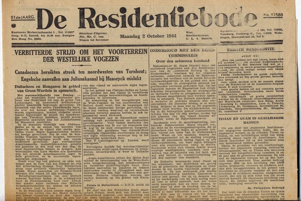 Een 'ringbandalbum' van het merk "Duopress" met een zwarte kartonnen kaft. Op de rug de titel: "Nederland 2 October 1944 - 27 Februari 1945". In het album zijn op doorzichtige vellen papier krantenknipsels geplakt die gaan over alles wat met de oorlog in deze periode te maken heeft. Tussen de geplakte krantenknipsels zijn ook andere documenten te vinden in het album: - Kranten, bulletins, mededelingenbladen: * "De Residentiebode. 51ste Jaargang. Maandag 2 October 1944; * "Trouw. Tweede Jaargang No. 14. Begin October 1944; * "Oranje-Bulletin no. 9. Uitgegeven Door: De Geus, Je Maintiendrai, Ons Volk, Op Wacht, Trouw, Het Parool, De Ploeg, Vrij Nederland, De Waarheid en de Nieuwsorganen. Uitgave voor Den Haag en Delft". De artikelen gaan over gebeurtenissen begin oktober 1944; * "Ons Volk. Den Vaderlant Ghetrouwe. Vierde Extra-nummer. 9 October 1944". De letters van Ons Volk zijn met kleurpotlood ingekleurd in de kleuren van de Nederlandse vlag; * "Oranje-Bulletin no. 10. Uitgegeven Door: De Geus, Je Maintiendrai, Ons Volk, Op Wacht, Trouw, Het Parool, De Ploeg, Vrij Nederland, De Waarheid en de Nieuwsorganen. Uitgave voor Den Haag en omstreken en Delft". De artikelen gaan over gebeurtenissen van half oktober 1944; * "Ons Volk. Den Vaderlant Ghetrouwe. 5de Extra-nummer. 18 October 1944"; * "Officieele Mededeelingen met betrekking tot de distributie- en andere aangelegenheden. Uitgegeven door de gemeente 's-Gravenhage. No. 3 - Vrijdag 20 October 1944; * "Lochemsche Courant. Dinsdag 24 October 1944. 66ste Jaargang No. 90; * "Oranje-Bulletin no. 11. Uitgegeven Door: De Geus, Je Maintiendrai, Ons Volk, Op Wacht, Trouw, Het Parool, De Ploeg, Vrij Nederland, De Waarheid en de Nieuwsorganen. Uitgave voor Den Haag en omstreken en Delft". De artikelen gaan over gebeurtenissen van oktober 1944; * "Oranje-Bulletin no. 12. Uitgegeven Door: De Geus, Je Maintiendrai, Ons Volk, Op Wacht, Trouw, Het Parool, De Ploeg, Vrij Nederland, De Waarheid en de Nieuwsorganen. Uitgave voor Den Haag en omstreken en Delft". De artikelen gaan over gebeurtenissen van eind oktober 1944; * "Oranje-Bulletin no. 13. Uitgegeven Door: De Geus, Je Maintiendrai, Ons Volk, Op Wacht, Trouw, Het Parool, De Ploeg, Vrij Nederland, De Waarheid en de Nieuwsorganen. Uitgave voor Den Haag en omstreken en Delft". De artikelen gaan over gebeurtenissen van eind oktober 1944; * "Het Nationale Dagblad. 8e Jaargang No. 302. Woensdag 25 October 1944; * "Het Nationale Dagblad. 8e Jaargang No. 304. Vrijdag 27 October 1944; * "Het Nationale Dagblad. 8e Jaargang No. 307. Dinsdag 31 October 1944; * "De Stem. Voor God, Koningin en Vaderland. Bulletin-uitgave. No. 1 Woensdag 1 Nov. 1944 no.1 Editie voor Westelijk Brabant"; * "Extra Oranje-Bulletin" waarin gewaarschuwd wordt voor de textielinlevering ten behoeve van de Duitse troepen; * "Mededeelingenblad Trouw. No. 6. 7 november 1944; * "De Residentiebode. 51ste Jaargang. Zaterdag 11 November 1944; * "Het Parool. Vrij Onverveerd. Dinsdag 14 November 1944. Nummer 73 (Vierde Jaargang); * "Ons Volk. Den Vaderlant Ghetrouwe. No. 18. 2de Novembernummer 1944"; * "Oranje-Bulletin no. 20. Uitgegeven door: De Geus, Je Maintiendrai, Ons Volk, Op Wacht, De Opdracht, Het Parool, De Ploeg, Trouw, Vrij Nederland, De Waarheid en de Nieuwsorganen. Uitgave voor Den Haag, omstreken en Delft". Gestencilde versie; * "Oranje-Bulletin no. 20. Tweede uitgave. Uitgegeven door: De Geus, Je Maintiendrai, Ons Volk, Op Wacht, De Opdracht, Het Parool, De Ploeg, Trouw, Vrij Nederland, De Waarheid en de Nieuwsorganen. Uitgave voor Den Haag en omstreken en Delft". De artikelen gaan over gebeurtenissen van eind November 1944; * "Vrij Nederland, Nederland Oranje. 'De Kop Op en er Recht tegenin!'"; * "Oranje-Bulletin. Uitgegeven door samenwerking van de ondergrondse pers. Zaterdag 25 November 1944. No. 30"; * "Oranje-Bulletin no. 21. Uitgegeven door: De Geus, Je Maintiendrai, Ons Volk, Op Wacht, De Opdracht, Het Parool, De Ploeg, Trouw, Vrij Nederland, De Waarheid en de Nieuwsorganen. Uitgave voor Den Haag en omstreken en Delft". De artikelen gaan over gebeurtenissen van eind November 1944; * "Oranje-Bulletin no. 37. Bulletin ter verspreiding van de letterlijke tekst van Regeringsverklaringen, bevelen van het Geallieerd Opperbevel en aanwijzingen van het ondergrondse verzet. Met medewerking van De Geus, Ons Volk, Het Parool, Vrij Nederland, Je Maintiendrai, Voor God en den Koning, De Waarheid, Trouw, Ons vrije Nederland, De Nieuwsbode en Slaet op den Trommele. De artikelen gaan over gebeurtenissen van eind November 1944; * "De Residentiebode. 51ste Jaargang. Donderdag 30 November 1944; * "Trouw. Tweede Jaargang No. 16. Eind November 1944; * "Pamphlet. Maandag 4 Dec. 1944". Gestencild blaadje waarin nieuws over de vorderingen op de verschillende fronten wordt vermeld; * "Oranje-Bulletin no. 22. Uitgegeven door: De Geus, Je Maintiendrai, Ons Volk, Op Wacht, De opdracht, Het Parool, De Ploeg, Trouw, Vrij Nederland, De Waarheid en de Nieuwsorganen. Uitgave voor Den Haag en omstreken en Delft". Gestencilde versie. De artikelen gaan over gebeurtenissen van begin December 1944; * "Trouw. Tweede Jaargang No. 18. Begin December 1944; * "Trouw. No. 19. Woensdag 6 December 1944. Speciale Uitgave voor Amsterdam en omstreken"; * "Trouw. No. 20. Vrijdag 8 December 1944. Speciale Uitgave voor Amsterdam en omstreken"; * "Het Vaderland. Staat- en Letterkundig Nieuwsblad. Zaterdag 9 December 1944. 76ste Jaargang"; * "Oranje-Bulletin no. 44. Bulletin ter verspreiding van de letterlijke tekst van Regeringsverklaringen, bevelen van het Geallieerd Opperbevel en aanwijzingen van het ondergrondse verzet. Met medewerking van De Geus, Ons Volk, Het Parool, Vrij Nederland, Je Maintiendrai, Voor God en den Koning, De Waarheid, Trouw, Ons vrije Nederland en Slaet op den Trommele. De artikelen gaan over gebeurtenissen van begin December 1944; * "Trouw. No. 21. Zaterdag 9 December 1944. Speciale Uitgave voor Amsterdam en omstreken"; * "Trouw. Nummer 6. Speciale uitg