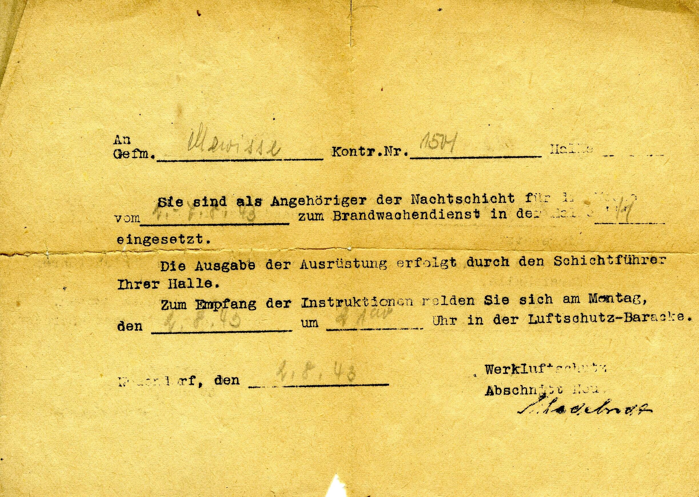 Een oproep voor "Mewisse" om zich te melden voor een instructie in de "Luftschutz-Baracke" voor de "Brandwachendienst" tijdens de nachtdienst. Gedateerd: 2 augustus 1943.