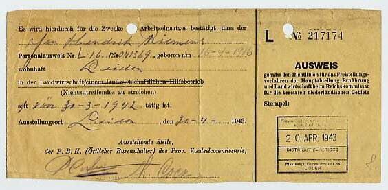 Voorgedrukte en met potlood verder ingevulde Duitstalige bon waaruit blijkt dat Jan Riemens uit Leiden wegens zijn werk in de agrarische sector vrijgesteld is van de arbeidsinzet.