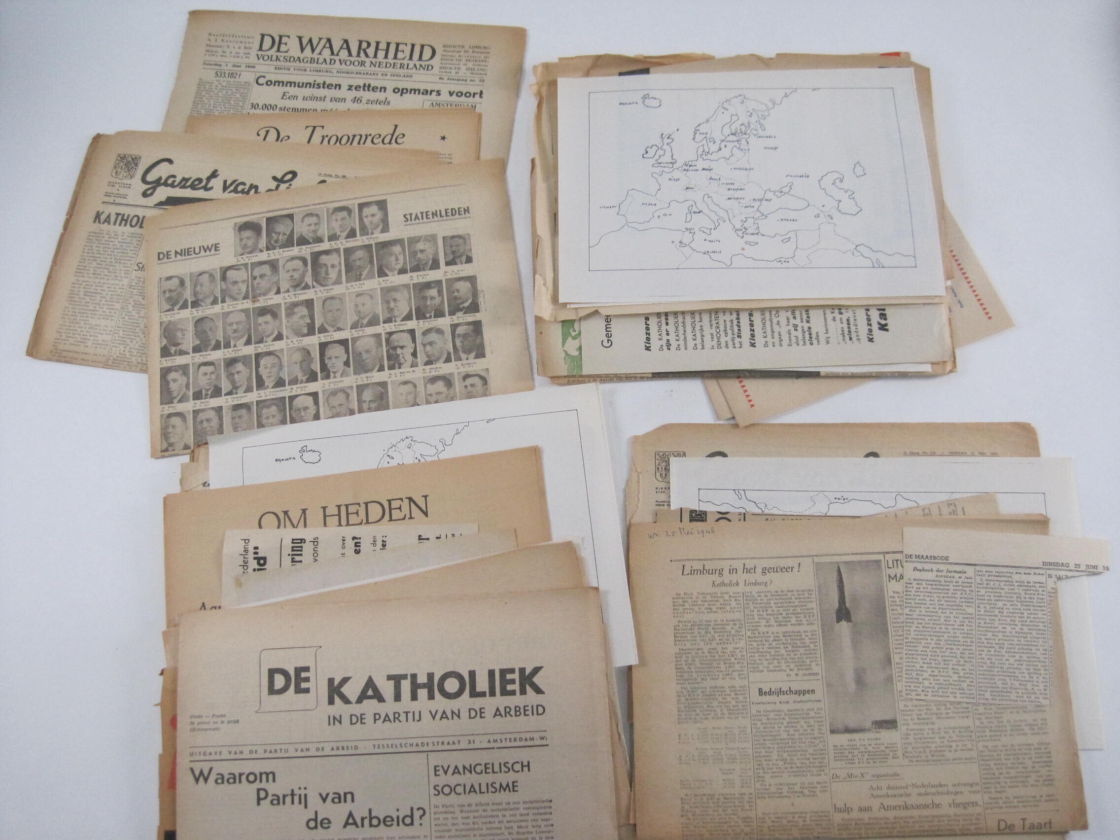 Verkiezingsmateriaal van verscheidene politieke partijen in 1946: Partij van de Arbeid (PvdA), Katholieke Volkspartij (KVP) en overige Katholieke partijen, liberalen: Bond van Jong-Liberalen en Partij van de Vrijheid (voormalige Liberale Staatspartij). Het materiaal bestaat uit affiches, programma's, folders, partijbladen, algemeen en voor de gemeenteraadsverkiezing van Maastricht.