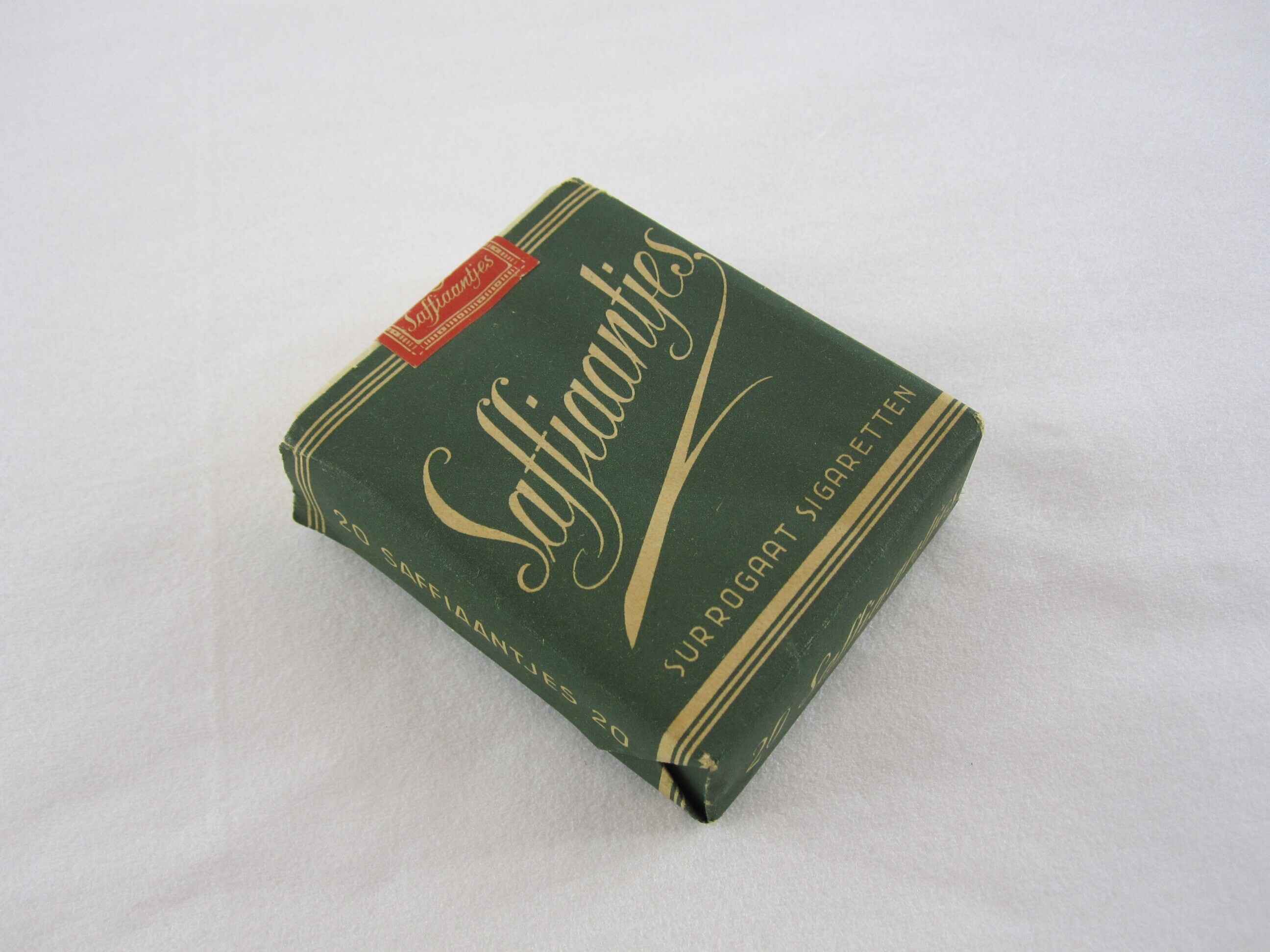 Een onaangebroken pakje sigaretten van het merk: "Saffiantjes surrogaat sigaretten"met intacte banderol. Op de achterkant van het pakje staat: "Saffiaantjes worden op moderne hygiënische wijze gefabriceerd uit de zuiverste grondstoffen. De uiterste zorg werd besteed aan reuk, smaak en zachtheid op de keel. handelmy "Just Love" Rijswijk Z.H.".