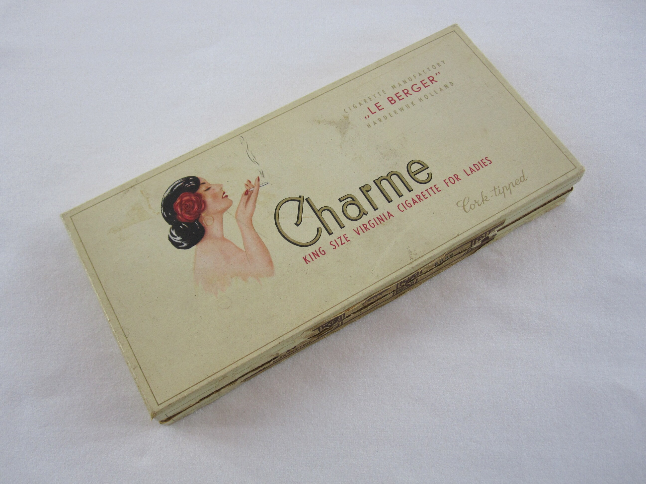 Een op één sigaret na volledig gevulde doos sigaretten met op de bovenkant van het deksel een portret van een rokende 'Spaanse(?)" dame van rechts en profil afgebeeld en de tekst: "Cigarette Manufactory "Le Berger" Harderwijk Holland. Charme King Size Virginia Cigarette For ladies. Cork-tipped".